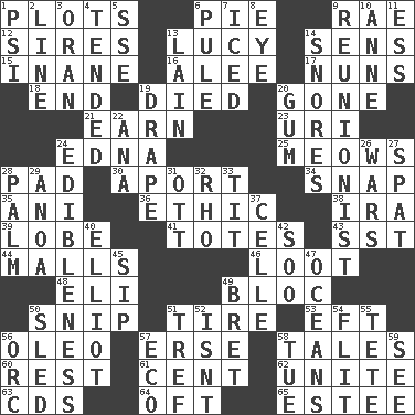 ACROSS 1. Small pieces of grounds 6. Sliced dessert 9. Actress Charlotte 12. Male parents of animals 13. "I Love _" 14. Elected reps. 15. Lacking in sense or substance 16. Toward shelter 17. Religious women 18. Conclusion 19. Passed on 20. Went 21. Merit 23. RI univ. 24. Pulitzer Prize-winning author Ferber 25. Catcalls? 28. Writing tablet 30. To the left, to Queeg 34. Fastener 35. Cuckoo 36. Principle of right and wrong 38. Retirement account (abbr.) 39. Ear part 41. Hauls 43. Fast jet (abbr.) 44. Promenades 46. Spoils 48. Biblical high priest 49. Alliance 50. Sever or remove by pinching or nipping 51. Become fatigued 53. Newt 56. Butter sub 57. Celtic language 58. Stories 60. Relief 61. Penny 62. Join together 63. Music discs 64. Often (poetically) 65. First name in cosmetics DOWN 1. Air pressure measure (abbr.) 2. Actor's bit 3. NW Algerian seaport 4. Looked after 5. Compass dir. 6. Whine 7. On the rocks 8. Sight organ 9. One who advocates reunion 10. Queen of England 1702-14 11. Curvy letter 13. (Had) reclined 14. Sounds asleep 19. Window treatment 20. Chewing product 22. Santa ___, CA 24. The property of being fit to eat 26. Armed conflicts 27. Argument over a trivial matter 28. Inside of hand 29. Small Philippine buffalo 31. Baseball player Mel 32. 17th letter of the Greek alphabet 33. Teat (slang) 37. Cell (Danish) 40. American author Paul (1891-1958) 42. "Barney Miller" actor Jack 45. Small drink 47. Seas 49. Cy Young winner Saberhagen 50. Downhill vehicle 51. Not kosher 52. Is not 54. Secret move to avoid paying debts 55. Wig 56. The grampus (Milton) 57. Environmental prefix 58. Third day of the wk. 59. Perceive with the eye