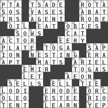 ACROSS 1. Parent Teacher Assoc. 4. Sadhe (variant) 9. Roll call or roster of names 13. Mayday 14. Flower holders 15. Blind as ____ 16. Big collection agency 17. Representative 18. Loose flowing garment 19. Petroleum 21. Ingest 22. Off-Broadway awards 24. Sty mamas 26. Feline 27. Thespian 29. Suggestive of the supernatural 30. Food holder 31. Ancient Roman robe 33. Plant excrement 36. Electrically charged atom 37. Inhabiting a nest 40. Period 41. Fitting 42. Floor coverings 43. Satellite of Uranus 45. Arab leader 47. Ancient Roman robes 48. Allow 49. Period of immesurable duration 50. Makes a sale 52. Pipe bend 54. Make a knot 56. Farming town in central California 57. Wear away 59. The grampus (Milton) 61. Butter sub 62. First name in cosmetics 63. River (Sp.) 64. Portable shelter 65. Memorize 66. Slangy assent DOWN 1. Air pressure measure (abbr.) 2. "Corrida" creature 3. Helper 4. Federal power corp. 5. Gurus 6. Toward the sea 7. Undesirable depression on a surface 8. Eastern Standard Time (abbr.) 9. Noteworthy scarcity 10. Mitch Miller's instrument 11. Bar bills 12. Had dinner 20. Spoils 22. Sea 23. Soap unit 25. Songbird 27. Capital of Western Samoa 28. Hoof sound 29. The front part of a cuirass 31. Russian ruler of old 32. Baseball player Mel 33. Signiory (variant) 34. Length times width 35. Friends 38. Gives off 39. Yard entry 44. Carrot, for example 45. American author Paul (1891-1958) 46. Cartoonist voice _ Blanc 49. Tree or shrub in the Birch family 50. Not divided or shared with others 51. Paradise 52. Celtic language 53. Globular water bottle used in Asia 55. One of the Great Lakes 56. Car dealer's back yard 57. Snakelike fish 58. Car or cant ending 60. Police officer (slang)