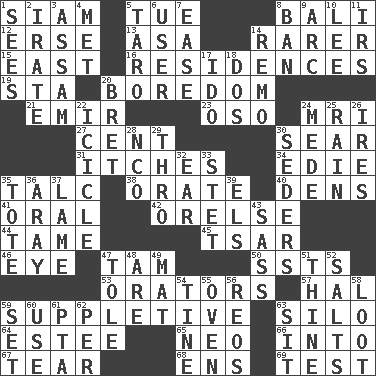 ACROSS 1. Thailand, formerly 5. Third day of the wk. 8. Indonesian resort city 12. Celtic language 13. White ___ sheet 14. More valued for its uncommonness 15. 90 degrees 16. Homes 19. R.R. building 20. Mood resulting from idleness 21. Independent ruler or chieftain 23. Bear (Spanish) 24. Medical imaging device (abbr.) 27. Penny 30. Singe 31. Strong, restless desires 34. Singer Brickell 35. Baby powder 38. Speak pompously 40. Cub Scout units 41. Spoken 42. Threatening words 44. Not wild 45. Russian ruler of old 46. Sight organ 47. Scottish cap 50. Fast planes 53. Speakers 57. Actor Linden 59. Supplementary 63. Grain storage tower 64. First name in cosmetics 65. Modern: prefix 66. To the inside or interior of 67. Rend 68. Followers of ems 69. Trial DOWN 1. Observes 2. Feeling or showing extreme anger 3. Indian state 4. Was introduced to 5. Pacific island yam 6. One who makes use of a thing 7. Relaxation 8. Bar 9. Curve 10. Area sheltered from the wind 11. Big collection agency 14. San ____ (Riviera town) 17. Wedding promise 18. Two (Sp.) 20. Cy Young winner Saberhagen 22. Ice on the eave 24. Ancient Persian 25. Water falling in drops from the sky 26. Angers 28. Non-commissioned officer (abbr.) 29. Through, poetically 30. Spring feasts 32. Hearing organ 33. Proofreading order 35. Carry 36. Like ___ of sunshine 37. Unable to walk 39. Raised railways 43. Backtalk 47. Lacquered or enameled metalware 48. "We ___ not amused" (Victoria) 49. Floor covering 51. One or ones belonging to thee 52. Table seasonings 54. Prong on a fork 55. Baking chamber 56. Vintage cars 58. Plunder 59. Put into a specified state 60. Purpose 61. Parent Teacher Association (abbr.) 62. For each 63. Be seated