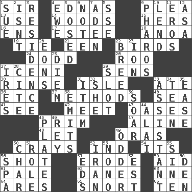 ACROSS 1. Title for a knight 4. Ferber et al. 9. Entreaty 13. Purpose 14. Forest 15. Possessive pronoun 16. Followers of ems 17. First name in cosmetics 18. Small Philippine buffalo 19. Standoff 21. Car or cant ending 22. Avian creatures 24. Texas town _ City 26. Friend of Pooh 27. Ancient Celtic tribe of eastern Britain 29. Elected reps. 30. Wash lightly 31. Small island 33. Had dinner 36. And so on (abbr.) 37. Modes 40. Ocean 41. Observe 42. Confront 43. Fertile tracts in a desert 45. Demure 47. Place in a line 48. Allow 49. Mouths or openings 50. Trading vessels 52. Indiana (abbr.) 54. It is 56. Attempt 57. Wear away 59. Help 61. Diluted with white 62. Natives or inhabitants of Denmark 63. Compass dir. 64. Ancient Greek god of war 65. Derisive sound 66. Nine, plus one DOWN 1. Take to court 2. Is not 3. Home 4. She-sheep 5. Administered medicine 6. Brief written record 7. Arabian gulf 8. Compass dir. 9. N Egypt peninsula 10. Grant temporary use of 11. Greek god of love 12. White ___ sheet 20. Immeasurably long periods of time 22. A special lineage 23. Electrically charged atom 25. South Vietnam president (1954) 27. Angers 28. Quote 29. Groove 31. Detail 32. A female animal or person 33. Helper 34. Adolescent 35. Relaxation 38. Gives off 39. Fly high 44. Mountain range southwest of Kyrgyzstan 45. Food holders 46. Marina Del _, California 49. More peculiar 50. Burn to charcoal 51. Hero or heavy, e.g. 52. SW Asia republic 53. Words to Nanette 55. Trig term 56. Health resort 57. Begley and Asner 58. Eastern Standard Time (abbr.) 60. Lair