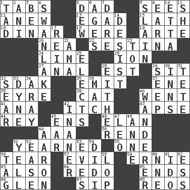 ACROSS 1. Bar bills 5. Male parent 8. Perceives with the eye 12. Afresh 13. Mild oath 15. Thin strip of wood or metal 16. Middle Eastern gold or silver currency 18. Past tense of be (plural) 19. Johnson of "Laugh-In" 20. Teachers' org. 22. French poetic form 24. Citrus frut 26. Electrically charged atom 27. Of or related to the anus 28. Eastern Standard Time (abbr.) 29. Be seated 32. Neighbor of Neb. 35. Send forth 37. Compass dir. 38. Jane of fiction 39. Feline 40. Left 41. Santa ___, CA 42. Hankering 43. Domed church section 44. Marina Del _, California 45. Followers of ems 46. Flair 49. Auto club (abbr.) 50. Tear apart 51. Felt deep pity or tenderness 55. Single 56. Separate forcefully 57. Tending to cause great harm 59. Bert's buddy 63. In addition 64. Redecorate 65. Extremities 66. Small, secluded valley 67. Small drink 68. Vintage cars DOWN 1. Small boy 2. Black tropical American cuckoo 3. Benjamin's nick name 4. Tchaikovsky ballet 5. Morning condensation 6. Ripens 7. Have the gumption 8. Killed 9. Merit 10. Singer James 11. A female animal or person 14. Stop 17. It's straight from the horse's mouth 21. Nanny (var.) 23. Small child 25. Opts 28. One or the other 29. Ooze 30. Lodging establishments 31. False hair 32. Wither 33. Centimeter-gram-second unit of force 34. Like ___ of sunshine 36. Apple computer (short form) 40. Nomad 42. More lacking in sense or substance 45. Hearing organ 47. Lion 48. Queen of England 1702-14 49. Composer Copland 51. Shout 52. Comfort 53. Nights before holidays 54. "You Light Up My Life" star Conn 56. Label 58. Chop off 60. Compass dir. 61. Wedding promise 62. Curvy letter