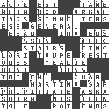 ACROSS 1. Measure of real estate 5. Eastern Standard Time (abbr.) 8. Docile 12. It's straight from the horse's mouth 13. Friend of Pooh 14. Therefore, facetiously 15. Bits 16. Wine waiters 19. Compass dir. 20. Commissioned military rank 21. Son of Isaac 23. Retirement account (abbr.) 24. Begley and Asner 27. Fast planes 30. Actor Baldwin 31. Flight of steps 34. A pale, very dry sherry 35. Australian parrot (variant) 38. Grayish beige 40. Repose 41. Lyric poems 42. Ear of corn 44. Gouge 45. Metal containers 46. Wedding promise 47. Australian flightless bird 50. Burn to charcoal 53. Chrissie's court nemesis 57. Plant excrement 59. Conciliate 63. "____ silly question..." 64. Bake eggs in their shells 65. Mountains (abbr.) 66. Adolescent 67. Lacquered or enameled metalware 68. Plant holder 69. Extremities DOWN 1. Johnson of "Laugh-In" 2. Desist 3. Amusement-park features 4. Followers of ems 5. Celtic language 6. Within a short period 7. Heavy book 8. Three (prefix) 9. Ripen 10. Make imperfect 11. Raised railways 14. Silent film actress Nazimova 17. Medical imaging device (abbr.) 18. Hearing organ 20. Abrupt rush of wind 22. Help 24. Writer Wiesel 25. Habitations of wild animals 26. Highlander 28. Make lace 29. Thailand, formerly 30. Anew 32. Regret 33. Argument over a trivial matter 35. Farming town in central California 36. Wrote a lyric poem 37. Former U.S. Attorney General Janet 39. Connecticut Ivy Leaguer 43. South American Indian 47. Independent ruler or chieftain 48. Floor covering 49. RI univ. 51. NE Netherlands city 52. Swept the length of 54. Pack (down) 55. "Tell ____ the Marines!" 56. Egg locale 58. Baking dishes 59. Pacific Standard Time (abbr.) 60. 17th letter of the Greek alphabet 61. Petroleum 62. Before (prefix) 63. Had dinner