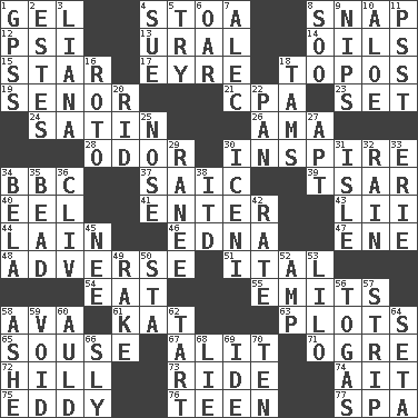 ACROSS 1. Set 4. Portico 8. Fastener 12. 23rd letter of the Greek alphabet 13. Mountain range 14. Petroleums 15. Play the lead 17. Jane of fiction 18. Traditional theme or motif 19. Sir (Sp.) 21. Accounting whiz (abbr.) 23. Put into a specified state 24. Smooth fabric 26. Wet nurse (var.) 28. Aroma 30. Stimulate to action 34. English channel? 37. Ketch in the Levant 39. Russian ruler of old 40. Snakelike fish 41. Keyboard key 43. Cards in a Roman deck? 44. (Had) reclined 46. Pulitzer Prize-winning author Ferber 47. Compass dir. 48. Contrary to your interests or welfare 51. Slanted text style (abbr.) 54. Consume 55. Gives off 58. Actress Gardner 61. Krazy ___ of comics 63. Schemes 65. Lush 67. Set down 71. Legendary monster 72. Land elevation 73. Travel on an animal 74. Small island 75. Whirlpool 76. Adolescent 77. Health resort DOWN 1. Global Positioning Systems (abbr.) 2. _____ Park, CO 3. Climbing, woody, usually tropical vines 4. Institute legal proceedings 5. Attempt to accomplish something 6. Boat paddle 7. Actor Baldwin 8. "Barney Miller" actor Jack 9. Pinches, bites 10. Medicinal plant 11. Inconspicuous attention getter 16. Printing process, for short 18. Scottish caps 20. To free from 22. Baking dish 25. Characteristic smell of wine 27. Fitting 29. Indian princess (variant) 30. Ancient Celtic tribe of eastern Britain 31. Small island 32. Water falling in drops from the sky 33. One of the Great Lakes 34. Actor Lugosi 35. Necklace unit 36. 154 in Roman numerals 38. It would 42. Pace 45. Born 49. Libertine 50. R.R. building 52. Electrical Unit 53. _ and Stitch 56. Ancient Roman robes 57. Long narrow piece of something 58. American tennis player Robert 59. Lacking any legal or binding force 60. Old (Scot.) 62. Small pie 64. Bristle 66. Wily 68. Untruth 69. Binary compound 70. Nine, plus one