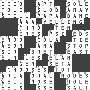 ACROSS 1. On the rocks 5. Fitting 8. Flatfish 12. Lacquered or enameled metalware 13. Messy guy 15. Like ___ of sunshine 16. Not moving 18. Dad 19. Object of repulsion 20. Auto club (abbr.) 22. Crying or shouting loudly 24. Through, poetically 26. Nine, plus one 27. Angers 28. 23rd letter of the Greek alphabet 29. Begley and Asner 32. Inside; within (prefix) 35. Root beer relative 37. Standoff 38. Period of immesurable duration 39. Santa ___, CA 40. Close up, plug up 41. Title for a knight 42. Cy Young winner Saberhagen 43. Compass direction 44. Shade tree 45. French article 46. Enthusiasm 49. Commissioned military rank (abbr.) 50. Bristle 51. Elects 55. Small child 56. Operatic vocal solo 57. Spoken 59. Methods 63. Water source 64. Sense of smell 65. Hero or heavy, e.g. 66. Snakelike fish 67. Compass dir. 68. Table seasoning DOWN 1. It is 2. Small bed 3. Biblical high priest 4. Conveyance 5. Viper 6. Shaw product 7. Drink excessively 8. Unit of acoustic absorption 9. NW Algerian seaport 10. Long (Scottish) 11. Sight organ 14. Greek mezzo-soprano Agnes 17. Cowardly lion portrayer 21. "We ___ not amused" (Victoria) 23. Luau accessory 25. Motion picture awards 28. Food holders 29. Singer James 30. "Vaya con ____" 31. Back-to-school mo. 32. Relaxation 33. Famous astronaut Armstrong 34. Dormintory (informal) 36. Single 40. Legislators 42. Gillaume's butler role 45. Lion 47. Allow 48. Tiny particle 49. Finish lines 51. Algonquian 52. Land elevation 53. Greek god of love 54. Backtalk 56. Deep reverence 58. Area sheltered from the wind 60. ___ good deed 61. Pipe bend 62. Put into a specified state