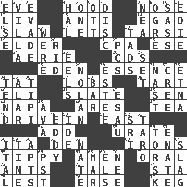 ACROSS 1. First lady 4. Parka part 8. Olfactory organ 12. 54 in ancient Rome 13. Opposed to 14. Mild oath 15. Cole _ (cabbage dish) 17. Allows 18. Tarsus (plural) 19. A person who is older than you are 21. Tax preparer (abbr.) 23. Compass dir. 24. Nest on high 26. Music discs 28. Locale of original sin 30. Gist 34. Make lace 37. Tennis shots 39. Small pie 40. Biblical high priest 41. Chalkboard 43. Elected rep. 44. California wine valley 46. Ancient Greek god of war 47. Afternoon social gathering 48. Popular '50s hangout 51. 90 degrees 54. Find the sum of 55. A salt of uric acid 58. Call ___ day 61. Lair 63. Removes the wrinkles 65. Likely to tip or tilt 67. So be it 71. Taken by mouth 72. Pismires 73. Lie 74. R.R. building 75. For fear that 76. Celtic language 77. Cask DOWN 1. Otherwise 2. Country estate 3. Elude 4. Actor Linden 5. Single 6. Baseball player Mel 7. Compact _ 8. Teachers' org. 9. Legendary monster 10. Backtalk 11. Singer Brickell 16. We are 18. Small amounts or degrees 20. To free from 22. Personal Computers (abbr.) 25. Snakelike fish 27. Put into a specified state 29. Pitcher Ryan 30. First name in cosmetics 31. Political cartoonist Thomas 32. Algonquian 33. Inactive volcano in Sicily 34. Look after 35. Having or resembling wings 36. Native american tent (variation) 38. Tavern 42. He sold his birthright 45. Actress Gardner 49. Whirlpool 50. Binary compound 52. Indian title of respect (Mr.) 53. Edible starchy tuberous root 56. Cod relative 57. Related on the mother's side 58. Slanted text style (abbr.) 59. Prong on a fork 60. Tenement units (abbr.) 62. Nathan's nickname 64. Volcanic refuse 66. Pacific Standard Time (abbr.) 68. Make imperfect 69. Raised railways 70. Born