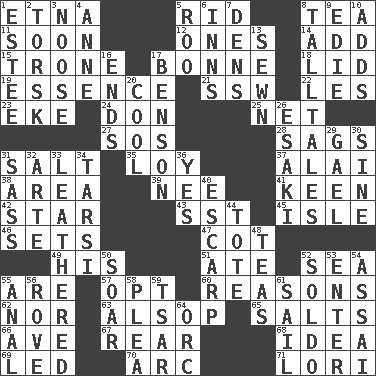 ACROSS 1. Inactive volcano in Sicily 5. To free from 8. Beverage made from leaves 11. Within a short period 12. Singles 14. Say or write further 15. Marketplace scale 17. Child's nurse 18. Hat (slang) 19. Center 21. Compass dir. 22. French article 23. Supplement with great effort 24. Spanish title 25. Fish or hair follower 27. Mayday 28. Sinks 31. Table seasoning 35. Myrna of the movies 37. Mountain range southwest of Kyrgyzstan 38. Length times width 39. Born 41. Peachy ____! 42. Play the lead 43. Fast jet (abbr.) 45. Capri or Wight 46. Puts into a specified state 47. Small bed 49. Part of HMS, perhaps 51. Had dinner 52. Ocean 55. "We ___ not amused" (Victoria) 57. Choose 60. Thinks logically 62. Not either 63. Columnist Joseph or Stewart 65. Table seasonings 66. "___ Maria" 67. Stern 68. It may be bright or harebrained 69. Directed 70. Curve 71. Australian parrot (variant) DOWN 1. First name in cosmetics 2. Cod relative 3. Trap for birds or small mammals 4. Queen of England 1702-14 5. Friend of Pooh 6. Restaurants 7. Lairs 8. Baron Munchausen's specialties 9. Singer Brickell 10. Does sums 13. Stitched 16. Conclusions 17. Gillaume's butler role 20. Calm and collected 26. 1973 Nobel Price Winner (Physics) Leo 29. Highlander 30. Trig term 31. Backtalk 32. Johnson of "Laugh-In" 33. Resembling or made to resemble leather 34. Tarsus (plural) 36. It is so 40. Fortification 44. Carry 48. Beverages made from leaves 50. Fly high 52. Twentieth part of a lira 53. Keyboard key 54. Slender Brazilian palm 55. Of or related to the anus 56. Be footloose 58. Entreaty 59. Russian ruler of old 61. Travel by water 64. The grampus (Milton)