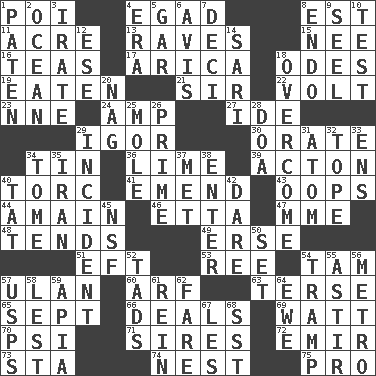 ACROSS 1. Luau course 4. Mild oath 8. Eastern Standard Time (abbr.) 11. 43,560 square feet 13. All-night dance parties 15. Born 16. Afternoon social gatherings 17. N. Chile seaport 18. Lyric poems 19. Ingested 21. Title for a knight 22. Electrical Unit 23. Compass dir. 24. Electrical Unit 27. Binary compound 29. Russian composer Stravinsky 30. Speak pompously 34. Shallow baking pan 36. Citrus frut 39. Gambison 40. Torque (variant) 41. Make improvements or corrections to 43. I made a mistake 44. At full speed 46. Singer James 47. Madame (abbr.) 48. Watches over 49. Celtic language 51. Bank Draft (abbr.) 53. To sift 54. Scottish cap 57. ____ Bator, Mongolia 60. Sandy's bark 63. Laconic 65. Back-to-school mo. 66. Allots cards 69. Electrical Unit 70. 23rd letter of the Greek alphabet 71. Male parents of animals 72. Independent ruler or chieftain 73. R.R. building 74. A home for chicks 75. Adept person DOWN 1. Eucharist need 2. Sea 3. Feeling or showing extreme anger 4. Period 5. Slender fish 6. Advice 7. Tenth: prefix 8. Inside; within (prefix) 9. Sew up the eyelids of hawks and falcons 10. Trial 12. Compass dir. 14. Indian skirt 18. Conquer 20. Tired old horse 25. Undercover agent 26. First class 28. ___ good deed 29. Happening 31. Tiny particle 32. Drink excessively 33. Followers of ems 34. Heavy book 35. SW Asia republic 37. Was introduced to 38. Keyboard key 40. Make lace 42. Have the gumption 45. Science/research agcy. 50. Put into a specified state 52. Small boys 54. _____ steamer (cargo ship) 55. Moving or stirring 56. Paris' subway 57. United States Postal Service (abbr.) 58. For fear that 59. Capital of Western Samoa 61. It's straight from the horse's mouth 62. Conductor's collection 64. She-sheep 67. French article 68. Fast jet (abbr.)