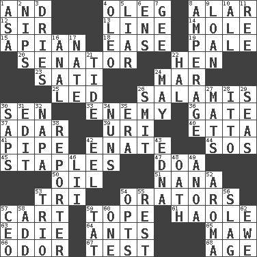 ACROSS 1. Plus 4. Cassini of fashion 8. Having or resembling wings 12. Title for a knight 13. Actor's bit 14. Undercover agent 15. Bee-related 18. Relaxation 19. Light colored 20. Elected representative 22. Layer 23. Suttee (variant) 24. Third mo. 25. Directed 26. Deli grouping 30. Elected rep. 33. Foe 36. Yard entry 37. The sixth month of the Jewish calendar 39. RI univ. 40. Singer James 41. Corncob 42. Maternal 44. Distress signal 45. Paper fasteners 47. ___ good deed 50. Lubricate 51. Grandmother 53. Three (prefix) 54. Speakers 57. Heavy open wagon 59. Drink excessively 61. White Person, in Hawaii 63. Singer Brickell 64. Pismires 65. Informal term for the mouth 66. Aroma 67. Trial 68. Ripen DOWN 1. White ___ sheet 2. Cuts off 3. Frees from moisture 4. Margarine 5. One who doesn't tell the truth 6. Followers of ems 7. Turn to the right 8. Electrical Measurement 9. Grant temporary use of 10. 100% 11. To riddle 16. Of or related to the anus 17. Nathan's nickname 21. Periodic rise and fall of the sea level 22. Actor Linden 24. Fifth month 26. Stricken, poetically 27. Floor coverings 28. "Tell ____ the Marines!" 29. Oceans 30. Plant excrements 31. Prepare for publication 32. California wine valley 34. Religious women 35. Epoch 38. News announcer 42. Snakelike fish 43. Pulitzer Prize-winning author Ferber 46. Cards in a Roman deck? 48. Pledge 49. Small Philippine buffalo 52. Odor 53. Musical group of three 54. Chooses 55. Relief 56. Volcanic refuse 57. Corporate head (abbr.) 58. Increase 59. Make lace 60. Single 62. She-sheep