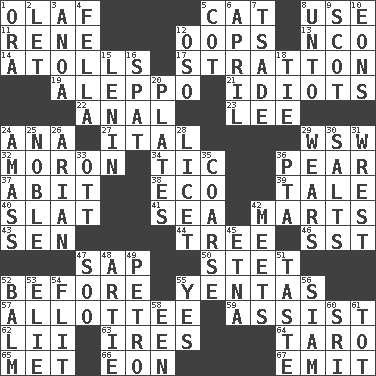 ACROSS 1. Norwegian king 5. Domesticated feline 8. Purpose 11. French philosopher Descartes 12. I made a mistake 13. Non-commissioned officer (abbr.) 14. Ringlike coral islands and reefs 17. Ski resort town in Vermont 19. City in Syria 21. Foolish or stupid persons 22. Of or related to the anus 23. Area sheltered from the wind 24. Santa ___, CA 27. Slanted text style (abbr.) 29. Compass dir. 32. Person of subnormal intelligence 34. Nervous spasm 36. Lightbulb-shaped fruit 37. "This won't hurt ____!" 38. Environmental prefix 39. Lie 40. Narrow board 41. Ocean 42. Shops 43. Elected rep. 44. Family _ (genealogy) 46. Fast jet (abbr.) 47. Plant excrement 50. Proofreading order 52. Prior to 55. Gossips 57. One to whom something is allotted 59. Help 62. Cards in a Roman deck? 63. Angers 64. Pacific island yam 65. Was introduced to 66. A really long time 67. Send forth DOWN 1. Mouth or opening 2. Allow 3. Small Philippine buffalo 4. Man or boy (slang) 5. Small bed 6. Showery time 7. Sadhe (variant) 8. To (old English) 9. Native of Scotland 10. Immeasurably long periods of time 12. Bear (Spanish) 15. Soviet premier 1918-24 16. Argument over a trivial matter 18. Neckwear 20. Food holders 24. Collect or gather 25. Having high moral qualities 26. Believer in; advocate of (suffix) 28. It is permitted: Lat. 29. Puts on (as clothing) 30. Table seasonings 31. Obtain by seizing forcibly or violently 33. Baseball player Mel 35. Unrefined 36. Parent Teacher Association (abbr.) 42. Confronts 45. Inactive volcano in Sicily 47. "Barney Miller" actor Jack 48. Nick name for Arthur 49. Stone: prefix 51. Clothes sense 52. Lip ointment 53. Writer Wiesel 54. Secret move to avoid paying debts 55. Consenting reply 56. Thailand, formerly 58. Car or cant ending 60. _ Lanka 61. Small child