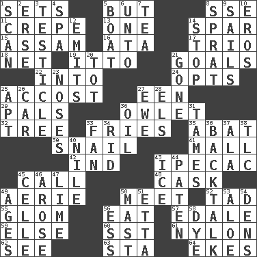 ACROSS 1. Arranges properly for use 5. Yet 8. Compass dir. 11. Streamer paper 13. Single 14. Coast Guard woman 15. Indian state 16. _ moment's notice (2 wds.) 17. Musical group of three 18. Fish or hair follower 19. "Tell ____ the Marines!" 21. Finish lines 22. To the inside or interior of 24. Chooses 25. Buttonhole 27. Car or cant ending 29. Friends 30. A small or young owl 32. Family _ (genealogy) 33. Strips of potato fried in deep fat 35. Blind as ____ 39. Slow-paced one 41. Shopping center 42. Working for oneself (abbr.) 43. Medicinal drug used to evoke vomiting 45. Give a ring to 48. Keg 49. Nest on high 50. Rendezvous 52. Small boy 55. Seize upon or latch onto something 56. Consume 57. Peak District village in England 59. Otherwise 60. Fast jet (abbr.) 61. Thermoplastic polyamide 62. Perceive with the eye 63. R.R. building 64. Supplements with great effort DOWN 1. Glance over 2. Celtic language 3. A testis 4. Health resort 5. Water vessel 6. To (old English) 7. Afternoon social gathering 8. Small fatty European fish 9. Travels by water 10. Greek god of love 12. Sends forth 14. Cease 20. Small child 21. Went 23. Olfactory organs 25. Fitting 26. 4-wheeled motor vehicle 27. She-sheep 28. Raised railways 30. Petroleum 31. Softens 33. Avid follower 34. To free from 36. Sass 37. In the manner of 38. Affectionate concern, for short 40. Mediterranean tributary 43. Frozen water 44. Eucharist need 45. Cell (Danish) 46. Came up 47. Citrus frut 49. Eras 50. Vertical spar for supporting sails 51. Singer James 53. Medicinal plant 54. Lairs 56. Curvy letter 58. Color