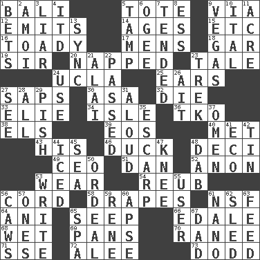 ACROSS 1. Indonesian resort city 5. Haul 9. By way of 12. Gives off 14. Eons 15. And so on (abbr.) 16. Sycophant 17. Not women's 18. Slender fish 19. Title for a knight 20. Slept 23. Falsehood 24. Southern CA. univ. 25. Hearing organs 27. Plant excrements 30. White ___ sheet 32. Pass on 33. Writer Wiesel 34. Capri or Wight 36. Ring climax 38. Raised railways 39. Greek goddess of the dawn 40. Was introduced to 43. Part of HMS, perhaps 46. Evade 48. Tenth: prefix 49. Corporate head (abbr.) 51. Daniel's nick name 52. Soon (poet.) 53. Erode 54. Reuben's nickname 56. Drawstring 58. Window treatments 61. Overdraft (abbr.) 64. Cuckoo 65. Ooze 66. Peak District village in England 68. Dripping 69. Baking dishes 70. The wife of a rajah (variant) 71. Compass dir. 72. Toward shelter 73. Texas town _ City DOWN 1. Wagers 2. Mine, in Marseilles 3. One who doesn't tell the truth 4. It would 5. Pack (down) 6. Double curve, resembling the letter S 7. Watched over 8. Double-curved letter 9. Viva Las _ 10. Slanted text style (abbr.) 11. 43,560 square feet 13. Synchronize (abbr.) 21. Jai ____ 22. Went by 23. Long journey 24. Purpose 26. Small island 27. Observe 28. 100% 29. Expression of disdain 31. Verbally 35. Fortification 37. Sign of things to come 41. Environmental prefix 42. Metal container 44. On the rocks 45. Ocean 47. Leg joint 48. Pat or tap gently 50. Severe or trying experience 53. Compose 55. One who uses or employs something 56. Crow sounds 57. Washington bills 59. French philosopher Descartes 60. Domed church section 61. Billionth: prefix 62. Downhill vehicle 63. Nourish 65. Health resort 67. Male parent