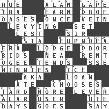 ACROSS 1. Sorrow 4. Actor Alda or Thicke 8. Stare wonderingly 12. Lyricist Gershwin 13. Merit 14. Mitch Miller's instrument 15. Fertile tracts in a desert 18. At one time in the past 19. Distinctive style or manner 20. Imposing or collecting, as a tax 22. Arrange properly for use 23. For fear that 24. Title for a knight 25. R.R. building 26. Normal relaxed breathing 30. Epoch 33. Cabin 36. Scent 37. Auction offers 39. Teachers' org. 40. Monthly bill 41. Double curve, resembling the letter S 42. Watches over 44. Compass dir. 45. Simpletons 47. Frozen water 50. Alias (abbr.) 51. Grant temporary use of 53. Had dinner 54. Elects 57. Pacific island yam 59. Greater amount 61. Crowbar 63. Having or resembling wings 64. One who uses or employs something 65. Shoshoni 66. 24-hour periods 67. Leaves 68. Declare DOWN 1. _ de Janeiro 2. Mountain range 3. Artist's stand 4. A really long time 5. Austrian-born American filmmaker Fritz 6. Curve 7. Compass dir. 8. Head of state? 9. Collude with 10. Luau course 11. Car or cant ending 16. Nights before holidays 17. System (abbr.) 21. Slanted text style (abbr.) 22. Small drink 24. Take to court 26. Mild oath 27. Lyric poems 28. Immeasurably long periods of time 29. Johnson of "Laugh-In" 30. Inky black, to poets 31. Swiss mountan, "Queen of the Mountains" 32. Arabian gulf 34. Singles 35. Lair 38. Elected representatives 42. Afternoon social gathering 43. Grain storage tower 46. Eisenhower's nickname 48. Calm and collected 49. Comfort 52. Congenital growth or mark on the skin 53. Like ___ of sunshine 54. Algonquian 55. Possessive pronoun 56. Stalk of a moss capsule 57. Bit 58. Insect wing 59. Large cup 60. Bear (Spanish) 62. Marina Del _, California