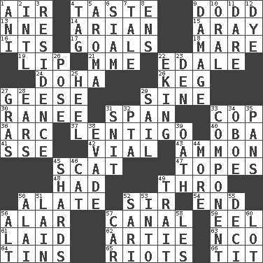 ACROSS 1. Wind 4. Clothes sense 9. Texas town _ City 13. Compass dir. 14. Believer in; advocate of (suffix) 15. Like ___ of sunshine 16. ___ a Wonderful Life 17. Finish lines 18. Female horse 19. Mouth edge 21. Madame (abbr.) 22. Peak District village in England 24. Capital of the state of Qatar 26. Cask 27. Honkers 29. Trig term 30. Indian princess (variant) 31. Connect, as a bridge 33. Police officer (slang) 36. Curve 37. Small, flat, pigmented spot on the skin 40. Chief or king in Benin or Nigeria 41. Compass dir. 42. Small bottle 43. ID or VA city 45. Go away! 47. Drinks excessively 48. Possessed 49. Through, poetically 50. Having winglike extensions 52. Title for a knight 54. Conclude 56. Having or resembling wings 57. Lessep's creation 59. Snakelike fish 61. Put down 62. Nick name for Arthur 63. Non-commissioned officer (abbr.) 64. Airtight sealed metal containers 65. Disturbances 66. Teat (slang) DOWN 1. Black tropical American cuckoo 2. International (abbr.) 3. Home 4. Label 5. Odor 6. Thailand, formerly 7. Lie 8. Followers of ems 9. Break 10. Of the mouth 11. Have the gumption 12. Color 20. Airs 22. Supplementing with great effort 23. Lair 25. The bottom of a shoe or boot 27. Pate de foie ____ 28. Hearing organs 29. Move on water 31. In a ____ (agitated or irritated) 32. Parent Teacher Assoc. 33. Part 34. Mitch Miller's instrument 35. Baking dishes 38. Dodge 39. Pledge 44. Greater amount 45. Pottery fragments 46. Domesticated feline 49. Distinguishing feature 50. Mountain range southwest of Kyrgyzstan 51. (Had) reclined 52. Indian skirt 53. To the inside or interior of 55. Tenth: prefix 56. The first octave above the treble staff 57. Auto 58. French article 60. Car dealer's back yard