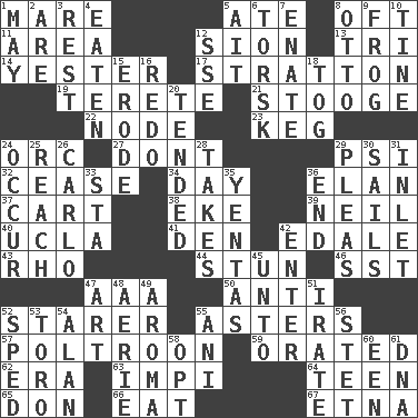 ACROSS 1. Female horse 5. Had dinner 8. Often (poetically) 11. Length times width 12. The Jewish people; Israel 13. Three (prefix) 14. Last 17. Ski resort town in Vermont 19. Cigar-shaped 21. Moe Howard, for one 22. Connecting point 23. Cask 24. The grampus (Milton) 27. Do not 29. 23rd letter of the Greek alphabet 32. Stop 34. 24 hours 36. Enthusiasm 37. Heavy open wagon 38. Make supply last 39. Famous astronaut Armstrong 40. Southern CA. univ. 41. Lair 42. Peak District village in England 43. 17th letter of the Greek alphabet 44. Astound 46. Fast jet (abbr.) 47. Auto club (abbr.) 50. Against 52. A viewer who gazes fixedly 55. Michaelmas daisies 57. Coward 59. Declaimed 62. Epoch 63. Body of Kaffir warriors 64. Adolescent 65. Spanish title 66. Erode 67. Inactive volcano in Sicily DOWN 1. Fifth month 2. "We ___ not amused" (Victoria) 3. Respite 4. Consumed 5. Small island 6. Cod relative 7. Related on the mother's side 8. Von Bismarck 9. Toadlike animal 10. Prong on a fork 12. Compass dir. 15. Wear away 16. Redecorate 18. Coat; cloak 20. Looked after 24. Come to pass 25. Arrive at 26. Monte _, Las Vegas Hotel/Casino 28. Receives possession of 29. Entreaties 30. Travels by water 31. An arm off of a larger body of water 33. R.R. building 35. Gossips 36. Conclude 42. Keyboard key 45. To (old English) 47. Tate display 48. Nest on high 49. Odor 51. Feeling or showing extreme anger 52. Moved rapidly 53. "Corrida" creature 54. Actor Alda or Thicke 55. Cuckoo 56. Proofreading order 58. Choose 60. Car or cant ending 61. Heredity factor (abbr.)