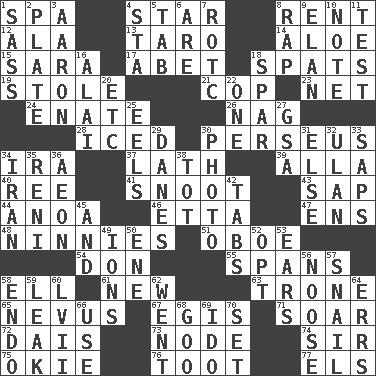 ACROSS 1. Health resort 4. Play the lead 8. Monthly bill 12. Chicken ___ king 13. Edible starchy tuberous root 14. _ vera 15. "Two Mules for Sister ____" 17. Collude with 18. Arguments over trivial matters 19. Took without asking 21. Police officer (slang) 23. Remaining after all deductions 24. Related on the mother's side 26. Tired old horse 28. On the rocks 30. Son of Zeus who helped slay Medusa 34. Lyricist Gershwin 37. Thin strip of wood or metal 39. Silent film actress Nazimova 40. To sift 41. Snout, nose 43. Plant excrement 44. Small Philippine buffalo 46. Singer James 47. Followers of ems 48. Simpletons 51. Mitch Miller's instrument 54. Spanish title 55. Connects, as a bridge 58. Pipe bend 61. ___ Haven, CT 63. Marketplace scale 65. Mole, birthmark 67. The front part of a cuirass 71. Fly high 72. Raised platform 73. Thickened enlargement 74. Title for a knight 75. Migrant worker of the '30s 76. A blast of a horn 77. Raised railways DOWN 1. Backtalk 2. Food holder 3. Composer Copland 4. R.R. building 5. Keyboard key 6. "We ___ not amused" (Victoria) 7. College mil. group 8. Reproach for some lapse or misdeed 9. Liveliness 10. Observe 11. Trial 16. Jai ____ 18. Coast Guard woman 20. And so on (abbr.) 22. Single 25. Snakelike fish 27. Girls' org. (abbr.) 29. Natives or inhabitants of Denmark 30. Picture 31. Otherwise 32. Uhlan (variant) 33. Plant excrements 34. SW Asia republic 35. Painter Guido (1575-1642) 36. Period of immesurable duration 38. Small child 42. Bar bills 45. Also 49. Charged particles 50. Compass dir. 52. Elect 53. Hearing organs 56. Trap for birds or small mammals 57. Slow-paced one 58. Inside; within (prefix) 59. Path through which fluid escapes 60. 57 in ancient Rome 62. Left 64. Blunders 66. Purpose 68. Thick or sticky substance 69. Wedding promise 70. Arrange properly for use