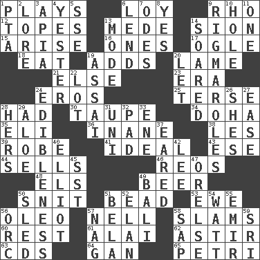 ACROSS 1. Live dramatic performances 6. Myrna of the movies 9. 17th letter of the Greek alphabet 12. Drinks excessively 13. Ancient Persian 14. The Jewish people; Israel 15. Originate 16. Singles 17. Stare at amorously 18. Consume 19. Sums up 20. Unable to walk 21. Otherwise 23. Period 24. Greek god of love 25. Laconic 28. Possessed 30. Grayish beige 34. Capital of the state of Qatar 35. Connecticut Ivy Leaguer 36. Silly 38. French article 39. Loose flowing garment 41. Perfect 43. Compass dir. 44. Exchanges for money 46. Vintage cars 48. Raised railways 49. Fermented drink made from hops 50. In a ____ (agitated or irritated) 51. Necklace unit 53. She-sheep 56. Margarine 57. 1994 drama film starring Jodie Foster 58. Hits or strikes with great force 60. Remainder 61. Mountain range southwest of Kyrgyzstan 62. Moving about 63. Music discs 64. Separate the seeds from cotton 65. _ dish (used to culture cells) DOWN 1. Parent Teacher Association (abbr.) 2. Old wives' tales, e.g. 3. Capital of Western Samoa 4. Of or pertaining to yesterday 5. Compass dir. 6. Grant temporary use of 7. Lyric poems 8. Affirmative reply 9. Complicated, petty procedures 10. Opening into or through something 11. Single 13. Method 14. Flew 19. Slender Brazilian palm 20. Allow 22. Car dealer's back yard 24. The property of being fit to eat 26. "______ My Girl" (Turtles hit) 27. Relaxation 28. Possessive pronoun 29. _ vera 31. Corn or form start 32. Groovy apt. 33. Compass dir. 37. Having ears or earlike features 40. American author Paul (1891-1958) 42. Area sheltered from the wind 45. Fast jet (abbr.) 47. Threatening words 49. Indonesian resort city 50. Downhill vehicle 51. Actor Lugosi 52. Enthusiasm 54. Electrical Unit 55. Arab leader 56. The grampus (Milton) 57. Tired old horse 58. Plant excrement 59. Indian title of respect (Mr.)