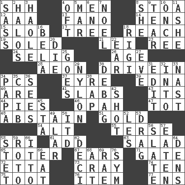 ACROSS 1. Quiet! 4. Sign of something about to happen 8. Portico 12. Auto club (abbr.) 13. Papal veil 14. Coop moms 15. Messy guy 17. Relationship diagram 18. Arrive at 19. Having a sole or soles 21. Flowery wreath 23. To separate or throw off 24. Former Milwaukee Brewers owner Bud 26. Ripen 28. A really long time 30. Popular '50s hangout 34. Personal Computers (abbr.) 37. Jane of fiction 39. Pulitzer Prize-winning author Ferber 40. "We ___ not amused" (Victoria) 41. Broad, flat, thick pieces 43. ___ a Wonderful Life 44. Sliced desserts 46. Brightly colored fish 47. Small child 48. Choose not to consume 51. Aureate 54. Keyboard modifier key 55. Laconic 58. _ Lanka 61. Increase 63. Vegetable dish 65. Carrier 67. Hearing organs 71. Yard entry 72. Singer James 73. Supercomputer manufacturer 74. Nine, plus one 75. A blast of a horn 76. A distinct part 77. Followers of ems DOWN 1. Backtalk 2. Rings 3. White Person, in Hawaii 4. Often (poetically) 5. Impair 6. Compass dir. 7. Christmas carol 8. A female animal or person 9. Rend 10. Single time 11. American tennis player Robert 16. Actor Lugosi 18. Swiss mountan, "Queen of the Mountains" 20. Expire 22. Hearing organ 25. Leaves 27. Night before a holiday 29. Thermoplastic polyamide 30. Debunk (Brit. slang) 31. Prepare for publication 32. To the inside or interior of 33. Political cartoonist Thomas 34. Dad 35. Baby bed with high sides 36. Observes 38. Hit sharply and swiftly 42. Opportunity 45. R.R. building 49. Having or resembling wings 50. It would 52. French article 53. To draw with force 56. Chalkboard 57. Eroded 58. Proofreading order 59. Printing process, for short 60. "Tell ____ the Marines!" 62. Tenth: prefix 64. Habitations of wild animals 66. Erode 68. Tate display 69. Actress Charlotte 70. Symbol (abbr.)