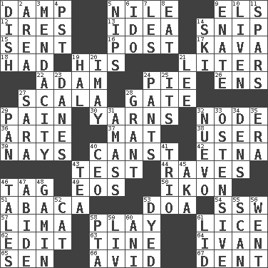 ACROSS 1. Moist 5. The longest river in the world 9. Raised railways 12. Angers 13. The content of cognition 14. Clip 15. Emitted 16. Mail 17. Polynesian shrub of the pepper family 18. Possessed 19. Part of HMS, perhaps 21. 61 cubic inches 22. First man 24. Sliced dessert 26. Followers of ems 27. Any of the three canals of the cochlea 28. Yard entry 29. Ache 30. Tall tales 32. Connecting point 36. Johnson of "Laugh-In" 37. Floor covering 38. One who makes use of a thing 39. Negative votes 40. 2nd pers. sing. pres. of can (arch.) 42. Inactive volcano in Sicily 43. Trial 44. All-night dance parties 46. Label 49. Greek goddess of the dawn 50. Visual representation of an object 51. Phillipine bananalike plant 53. ___ good deed 54. Compass dir. 57. Pale green bean 58. Frolic 61. Louse (plural) 62. Prepare for publication 63. Prong on a fork 64. "Terrible" tsar 65. Elected rep. 66. Enthusiastic 67. Gouge DOWN 1. Food container 2. Length times width 3. Ananias' fault 4. Pacific Standard Time (abbr.) 5. Cuts off 6. Wedding promise 7. French article 8. Ingest 9. Related on the mother's side 10. Make or become more lively 11. Practice fights 14. What Jean-Claude Killy likes to do 19. Actor Linden 20. "If ____ say so..." 21. Area sheltered from the wind 23. Natives or inhabitants of Denmark 24. Leg coverings 25. ___ a Wonderful Life 27. "Two Mules for Sister ____" 28. Let have 29. Baking dish 31. Collect or gather 32. New (sp.) 33. Clearly or manifestly demonstrative 34. Hiding places for outlaws 35. Epoch 40. Corporate head (abbr.) 41. Musical group of three 43. Afternoon social gathering 45. Alias (abbr.) 46. Stories 47. Remain 48. Homeless child 52. Feline 53. Colored 55. Examine hastily 56. Gone 58. Parent Teacher Association (abbr.) 59. 54 in ancient Rome 60. Cuckoo 61. Flaplike covering