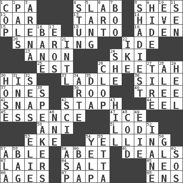 ACROSS 1. Accounting whiz (abbr.) 4. Thick slice 8. "______ My Girl" (Turtles hit) 12. Rowing implement 13. Pacific island yam 14. Hub of activity 15. Military trainee 18. To (old English) 19. Arabian gulf 20. Catching in a trap 22. Binary compound 23. Soon (poet.) 24. What Jean-Claude Killy likes to do 25. Eastern Standard Time (abbr.) 26. Leopard's kin 30. Part of HMS, perhaps 33. Dipping utensil 36. Drop; flow; fall 37. Washington bills 39. Friend of Pooh 40. Family _ (genealogy) 41. Fastener 42. Staphylococcus 44. Snakelike fish 45. Gist 47. Frozen water 50. Cuckoo 51. Farming town in central California 53. Supplement with great effort 54. Crying or shouting loudly 57. Competent 59. Collude with 61. Allots cards 63. Den 64. Table seasoning 65. Modern: prefix 66. Eons 67. Dad 68. Followers of ems DOWN 1. Police officer (slang) 2. Friends 3. Sports stadium 4. Make senseless or dizzy 5. Austrian-born American filmmaker Fritz 6. Tate display 7. Surprise greeting 8. Most questionable 9. Flintstone garb 10. First lady 11. Elected rep. 16. Object of repulsion 17. Greek god of love 21. International (abbr.) 22. Eisenhower's nickname 24. A female animal or person 26. Hoof sound 27. Become fatigued 28. Toward shelter 29. Person who is morally reprehensible 30. Stockings 31. Taverns 32. Oceans 34. Johnson of "Laugh-In" 35. ___ good deed 38. Orators 42. _-fi 43. Land elevation 46. Compass dir. 48. Having a low temperature 49. Singer Brickell 52. Silly 53. Writer Wiesel 54. Sharp bark 55. Singer James 56. Small, secluded valley 57. Insect wing 58. Container for groceries 59. Cleo's killer 60. Sound made by sheep 62. Mayday