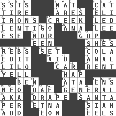 ACROSS 1. Fast planes 5. Floor protector 8. Feline 11. Hoop that covers a wheel 12. Ancient Greek god of war 14. Connecticut Ivy Leaguer 15. Metal shackles 17. Small stream 18. Directed 19. Small, flat, pigmented spot on the skin 21. Santa ___, CA 22. Area sheltered from the wind 23. Compass dir. 24. And not 25. Republican Party 27. Car or cant ending 28. "______ My Girl" (Turtles hit) 31. Confederate soldiers (slang) 35. Put into a specified state 37. Root beer relative 38. Prepare for publication 39. Assist 41. Of or related to the anus 42. _ and Stitch 43. Auto 45. Monthly bill 46. Shout 47. Atlas unit 49. Benjamin's nick name 51. "One Day ___ Time" 52. Followers of ems 55. Modern: prefix 57. Clumsy lout 60. Commissioned military rank 62. Alias (abbr.) 63. Window treatment 65. Before Barbara or Clara 66. For each 67. Inactive volcano in Sicily 68. Thailand, formerly 69. Find the sum of 70. Period of immesurable duration 71. Snakelike fish DOWN 1. Vertical member of a panel or frame 2. Begets 3. Heavy duty weighing machine 4. Posted 5. Spoil 6. Length times width 7. Adolescent 8. Portable communications device 9. Toward shelter 10. Periodic rise and fall of the sea level 13. Heroin 16. Trig term 17. Pupil covering 20. Travels 26. Witty Wilde 29. Flair 30. Table seasoning 31. Have trust in 32. Singer Brickell 33. Big road sign 34. Took without asking 36. Nervous spasm 40. Break 44. Pace 48. Zero-star reviews 50. Connecting point 52. Bert's buddy 53. Brizilian seaport 54. Shuts with force 55. California wine valley 56. Supplemented with great effort 58. Johnson of "Laugh-In" 59. Papal veil 61. Relaxation 64. Baking dish