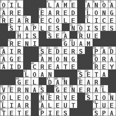 ACROSS 1. Lubricate 4. Unable to walk 8. Small Philippine buffalo 12. "We ___ not amused" (Victoria) 13. Having ears or earlike features 14. Protracted 15. Posterior 17. Learning spot: Fr. 18. Louse (plural) 19. Paper fasteners 21. Annoying sounds 23. Part of HMS, perhaps 24. Ocean 26. Regret 27. Painter Guido (1575-1642) 28. Island territory of the United States 30. Atmosphere 31. Spring feasts 34. Groovy apt. 37. Mature 38. Amid 39. Mouth or opening 40. Help 41. Cause to be 42. Marina Del _, California 43. Grant temporary use of 44. Stalk of a moss capsule 46. Set 47. Daniel's nick name 50. Hearing organ 51. Actresses Bloom and Felton 54. Commissioned military rank 57. Margarine 58. Boldness 60. The Jewish people; Israel 62. One who doesn't tell the truth 63. Native American of Southwest Alaska 64. Third day of the wk. 65. False hair 66. Sliced desserts 67. Health resort DOWN 1. Rowing implement 2. Angers 3. Tough but pliablecoriaceous 4. Shoestrings 5. Came up 6. Cartoonist voice _ Blanc 7. Genesis locale 8. Plant genus of onion and garlic 9. Annoying sound 10. At one time in the past 11. Matures 13. Snakelike fish 16. Precipitation 20. 23rd letter of the Greek alphabet 22. Mouths or openings 25. Rep 27. Swiss mountan, "Queen of the Mountains" 29. Goad 30. American Automobile Association (abbr.) 31. "Two Mules for Sister ____" 32. Make improvements or corrections to 33. ___ good deed 34. Likenesses of persons 35. Length times width 36. 24 hours 41. Root beer relative 43. Poe poem 44. Perceive with the eye 45. Hearing organs 46. Relatively large 48. Match 49. Congenital growth or mark on the skin 51. Electrical Unit 52. Writer Wiesel 53. Fastener 55. Remaining after all deductions 56. Central Nebraska county 59. Connecticut Ivy Leaguer 61. Teachers' org.
