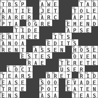 ACROSS 1. Cook's measure (abbr.) 5. Deep reverence 8. Bar bill 11. Nick name for Arthur 13. Type of plane 14. Lacquered or enameled metalware 15. More uncommon 16. Curve 17. Capital of Western Samoa 18. Parent Teacher Association (abbr.) 19. Legendary monster 21. Make improvements or corrections to 22. Periodic rise and fall of the sea level 24. Domed church section 25. Main course 27. ___ a Wonderful Life 29. Small Philippine buffalo 30. Prepares for publication 32. Monthly bill 33. NE Netherlands city 35. Stockings 39. _____ Park, CO 41. Baking chamber 42. Actress Charlotte 43. Cylindrical with tapered ends 45. Event scenes 48. One who uses or employs something 49. Rends 50. Cy Young winner Saberhagen 52. To free from 55. Relaxation 56. "Barney Miller" actor Jack 57. Dodge 59. Family _ (genealogy) 60. Plant holder 61. Consumed 62. Followers of ems 63. White ___ sheet 64. Afternoon social gatherings DOWN 1. Canvas cover 2. Naughty child 3. Ski resort town in Vermont 4. Sliced dessert 5. Partly open 6. Past tense of be (plural) 7. And so on (abbr.) 8. Drinks excessively 9. Place in a line 10. Necklace unit 12. Wear away 14. Pack (down) 20. Turn to the right 21. Compass direction 23. Feeling or showing extreme anger 25. Ewer handle 26. Compass dir. 27. Binary compound 28. Shallow baking pan 30. Curvy letter 31. Dinah or Pauly 33. "One Day ___ Time" 34. Perceive with the eye 36. Make much ado about nothing 37. Put into a specified state 38. Compass dir. 40. Indian titles of respect 43. Third day of the wk. 44. First name in cosmetics 45. Memorize 46. Fertile tracts in a desert 47. Algonquian 49. Wig 50. Scornful sounds 51. Roll call or roster of names 53. It may be bright or harebrained 54. Lairs 56. Health resort 58. Large container