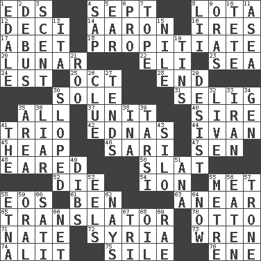 ACROSS 1. Begley and Asner 4. Back-to-school mo. 8. Globular water bottle used in Asia 12. Tenth: prefix 14. Composer Copland 16. Angers 17. Collude with 18. Conciliate 20. Type of eclipse 22. Connecticut Ivy Leaguer 23. Ocean 24. Eastern Standard Time (abbr.) 25. Sep. follower 28. Conclusion 30. Not divided or shared with others 31. Former Milwaukee Brewers owner Bud 35. Everything 37. A single undivided whole 40. Beget 41. Musical group of three 42. Ferber et al. 44. "Terrible" tsar 45. Pile 46. Indian skirt 47. Elected rep. 48. Having ears or earlike features 50. Narrow board 52. Expire 54. Electrically charged atom 55. Was introduced to 58. Greek goddess of the dawn 61. Benjamin's nick name 63. Approach 65. Interpreter 70. "Beetle Bailey" pooch 71. Nathan's nickname 72. Damascus' land 73. Songbird 74. Set down 75. Drop; flow; fall 76. Compass dir. DOWN 1. Peak District village in England 2. To get out of a bus 3. Aroma 4. Plant excrement 5. Hearing organ 6. Adept person 7. Drink excessively 8. Cards in a Roman deck? 9. Mouths or openings 10. Wig 11. At sea 13. Call ___ day 15. "Death on the ____" 19. Airtight sealed metal containers 21. Friend of Pooh 26. A slight indication 27. Watches over 29. Cease 30. Had an oblique or slanted direction 32. Not recorded 33. SW Asia republic 34. Commissioned military rank (abbr.) 35. Length times width 36. One who doesn't tell the truth 38. _ tizzy (2 wds.) 39. Tarsus (plural) 41. Definite Article 43. Grain storage tower 49. Claim 51. Santa ___, CA 53. Snakelike fish 55. Distance measurement (Brit.) 56. Eroded 57. Heavy duty weighing machine 58. Inactive volcano in Sicily 59. Spoken 60. Suttee (variant) 62. Negative votes 64. At this time 66. Remaining after all deductions 67. Three (prefix) 68. Lubricate 69. Actress Charlotte