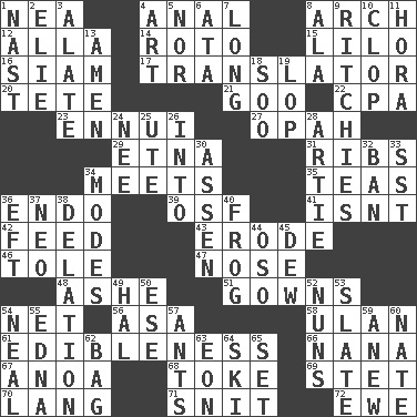 ACROSS 1. Teachers' org. 4. Of or related to the anus 8. Bowlike part 12. Silent film actress Nazimova 14. Printing process, for short 15. _ and Stitch 16. Thailand, formerly 17. Interpreter 20. Wig 21. Thick or sticky substance 22. Accounting whiz (abbr.) 23. World-weariness 27. Brightly colored fish 29. Inactive volcano in Sicily 31. Chest bones 34. Confronts 35. Afternoon social gatherings 36. Inside; within (prefix) 39. Order of Saint Francis (abbr.) 41. Is not 42. Nourish 43. Wear away 46. Lacquered or enameled metalware 47. Olfactory organ 48. American tennis player Robert 51. Long dresses 54. Fish or hair follower 56. White ___ sheet 58. Uhlan (variant) 61. The property of being fit to eat 66. Grandmother 67. Small Philippine buffalo 68. Casino tip 69. Proofreading order 70. Long (Scottish) 71. In a ____ (agitated or irritated) 72. She-sheep DOWN 1. Political cartoonist Thomas 2. Writer Wiesel 3. Having winglike extensions 4. Tate display 5. Not either 6. "One Day ___ Time" 7. Protracted 8. In the manner of 9. Actors Guy, Robert Welles, and Clint 10. Hoof sound 11. Israeli folk dance 13. So be it 18. "Barney Miller" actor Jack 19. Trim (branches) 24. Born 25. Shoshoni 26. To the inside or interior of 28. Nick name for Arthur 30. NE Netherlands city 32. Prohibit 33. Fast jet (abbr.) 34. Methods 36. Bank Draft (abbr.) 37. Modern: prefix 38. Accusation by an informer 40. Toadlike animal 44. Bear (Spanish) 45. Morning condensation 49. Actor Linden 50. Compass dir. 52. Religious women 53. Chalkboard 54. Actress Patricia 55. Pulitzer Prize-winning author Ferber 57. Pismires 59. Afresh 60. Nathan's nickname 62. Container for groceries 63. Period of immesurable duration 64. What Jean-Claude Killy likes to do 65. Put into a specified state