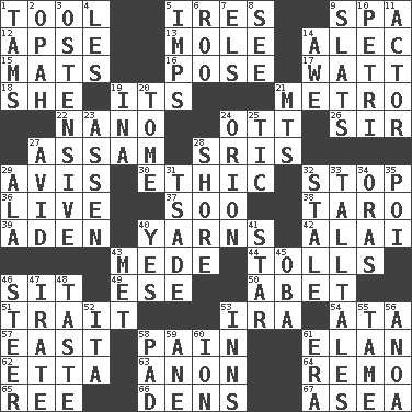 ACROSS 1. Utensil 5. Angers 9. Health resort 12. Domed church section 13. Undercover agent 14. Actor Baldwin 15. Floor coverings 16. Airs 17. Electrical Unit 18. A female animal or person 19. ___ a Wonderful Life 21. Paris' subway 22. Billionth: prefix 24. Baseball player Mel 26. Title for a knight 27. Indian state 28. Indian titles of respect 29. Deliberation 30. Value system 32. Constrict 36. Moving, as bait 37. "Barney Miller" actor Jack 38. Pacific island yam 39. An important port of Yemen 40. Entertaining tales 42. Jai ____ 43. Ancient Persian 44. For Whom the Bell _____ 46. Be seated 49. Compass dir. 50. Collude with 51. Distinguishing feature 53. Lyricist Gershwin 54. "One Day ___ Time" 57. 90 degrees 58. Ache 61. Style 62. Singer James 63. At once, immediately (arch.) 64. San ____ (Riviera town) 65. To sift 66. Habitations of wild animals 67. At sea DOWN 1. Scottish caps 2. Brightly colored fish 3. Clearly or manifestly demonstrative 4. French article 5. Naughty children 6. Friend of Pooh 7. Raised railways 8. Perceive with the eye 9. Narrow boards 10. _ dish (used to culture cells) 11. Thespian 14. Deep reverence 19. _ tizzy (2 wds.) 20. Heavy book 21. Mountains (abbr.) 23. NE Netherlands city 24. Constellation of myth 25. Nervous spasm 27. Enthusiastic 28. Dinah or Pauly 29. Chicken ___ king 31. Sadhe (variant) 32. Lacking originality or spontaneity 33. Baron Munchausen's specialties 34. Mouths or openings 35. Luau course 40. It is so 41. Play the lead 43. Was introduced to 45. Chief or king in Benin or Nigeria 46. Guide 47. Feeling or showing extreme anger 48. Clothes sense 52. Call ___ day 53. Lodging establishments 55. Not wild 56. Small Philippine buffalo 58. Writing tablet 59. One (Scot) 60. Electrically charged atom 61. Period