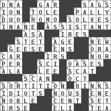 ACROSS 1. Heredity factor (abbr.) 4. Slender fish 7. Droops 11. Electrically charged atom 12. Lacquered or enameled metalware 13. Friendly 14. Superhero pair 15. Like (prefix) 16. Finds the solution 17. Silly 19. Helper 21. White ___ sheet 23. Angers 24. Proofreading order 25. Grow older 26. ___ Haven, CT 29. Honkers 30. Followers of ems 31. Mouth or opening 32. Auto 33. Big collection agency 34. And not 35. For each 36. _-fi 37. Fertile tracts in a desert 40. In the manner of 41. Area sheltered from the wind 42. Scram! 43. Glance over 45. Sep. follower 46. Casting lots 51. Pig sounds 55. Foolish or stupid persons 56. Horse sense 58. Compass dir. 59. Impressive in appearance 60. Penny 61. Put into a specified state 62. Celtic language 63. Biblical high priest 64. Beverage made from leaves DOWN 1. "You Light Up My Life" star Conn 2. Part of speech 3. Small Philippine buffalo 4. Thick or sticky substance 5. _ mater 6. Vintage cars 7. Table seasonings 8. Inventor's middle name 9. Small, secluded valley 10. System (abbr.) 12. College papers 13. Introduce or present, as a question 16. Fathers 18. Nathan's nickname 20. Signals 22. Had dinner 24. Father Junipero _ 25. Nest on high 26. Music written for nine 27. Greek god of love 28. Armed conflict 29. Highlander 32. Numbers guy (abbr.) 33. Ancient Celtic tribe of eastern Britain 36. Narrow boards 37. Bear (Spanish) 38. Buttonhole 39. Suttee (variant) 43. Took without asking 44. Quote 46. Trig term 47. Aroma 48. Chest bones 49. Single time 50. Christmas carol 52. A home for chicks 53. Leg joint 54. Bristle 57. University (slang)
