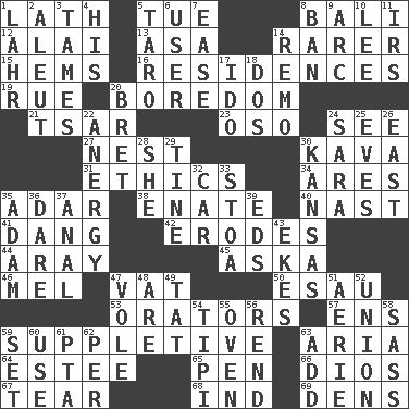 ACROSS 1. Thin strip of wood or metal 5. Third day of the wk. 8. Indonesian resort city 12. Mountain range southwest of Kyrgyzstan 13. White ___ sheet 14. More uncommon 15. Equivocates 16. Homes 19. Sorrow 20. Mood resulting from idleness 21. Russian ruler of old 23. Bear (Spanish) 24. Observe 27. A home for chicks 30. Polynesian shrub of the pepper family 31. Value system 34. Ancient Greek god of war 35. The sixth month of the Jewish calendar 38. Maternal 40. Political cartoonist Thomas 41. Mild oath, euphamism for damn 42. Eats (away) 44. Like ___ of sunshine 45. "____ silly question..." 46. Cartoonist voice _ Blanc 47. Large container 50. He sold his birthright 53. Speakers 57. Followers of ems 59. Supplying deficiencies 63. Operatic vocal solo 64. First name in cosmetics 65. Animal enclosure 66. "Vaya con ____" 67. Separate forcefully 68. Working for oneself (abbr.) 69. Lairs DOWN 1. Cowardly lion portrayer 2. Native American of Southwest Alaska 3. Corrects by punishment or discipline 4. Part of HMS, perhaps 5. Edible starchy tuberous root 6. One who makes use of a thing 7. Relaxation 8. Bar 9. Curve 10. Area sheltered from the wind 11. Big collection agency 14. San ____ (Riviera town) 17. Wedding promise 18. Two (Sp.) 20. Cy Young winner Saberhagen 22. Disorder of the immune system 24. "Two Mules for Sister ____" 25. Nights before holidays 26. Compass direction 28. A female animal or person 29. Prong on a fork 30. Sunflower state 32. Automobile 33. Portico 35. First man 36. Have the gumption 37. Of or related to the anus 39. Begley and Asner 43. Supplements with great effort 47. Grand slam 48. "We ___ not amused" (Victoria) 49. Make lace 51. Nest on high 52. The state of being joined or united 54. Native american tent (variation) 55. Baking chamber 56. Tear apart 58. Backtalk 59. Arrange properly for use 60. Purpose 61. Parent Teacher Assoc. 62. For each 63. Say or write further