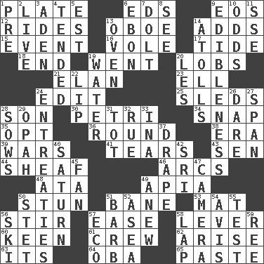 ACROSS 1. Food holder 6. Begley and Asner 9. Greek goddess of the dawn 12. Amusement-park features 13. Mitch Miller's instrument 14. Does sums 15. Happening 16. Short-tailed, large-bodied rat 17. Event that recurs at intervals 18. Conclusion 19. Gone 20. Tennis shots 21. Liveliness 23. Pipe bend 24. Prepare for publication 25. Bobsleighs 28. Male child 30. _ dish (used to culture cells) 34. Fastener 35. Elect 36. Having a circular shape 38. Epoch 39. Armed conflicts 41. Separates forcefully 43. Elected rep. 44. Archer's quiver 46. Curves 48. _ moment's notice (2 wds.) 49. Capital of Western Samoa 50. Astound 51. Object of repulsion 53. Floor protector 56. Use a swizzle stick 57. Comfort 58. Crowbar 60. Peachy ____! 61. Ship's personnel 62. Originate 63. It is 64. Chief or king in Benin or Nigeria 65. Thick mixture DOWN 1. Before (prefix) 2. Not recorded 3. An important port of Yemen 4. Watched over 5. Eastern Standard Time (abbr.) 6. Inky black, to poets 7. Dunce 8. Observe 9. The property of being fit to eat 10. Likelihood 11. Compass dir. 13. Baking chamber 14. Ringlike coral islands and reefs 19. Wetness 20. French article 22. Mouth edge 24. Pleas 26. Have the gumption 27. Connect, as a bridge 28. Sty mamas 29. Brightly colored fish 31. Small child 32. Sorrow 33. _ tizzy (2 wds.) 37. Window treatment 40. Titan orbits this 42. Indian title of respect (Mr.) 45. Air blower 47. Device for capturing images 49. Afresh 50. Proofreading order 51. Sharp remark 52. Toward the sea 54. Advice 55. Trial 56. What Jean-Claude Killy likes to do 57. Environmental prefix 58. Infant locale 59. To separate or throw off