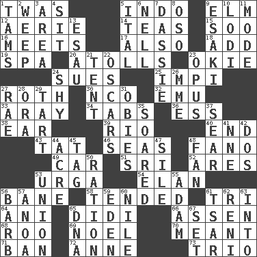 ACROSS 1. It was, poetically 5. Southeast Asian peninsula 9. Shade tree 12. Nest on high 14. Afternoon social gatherings 15. "Barney Miller" actor Jack 16. Confronts 17. In addition 18. Increase 19. Health resort 20. Ringlike coral islands and reefs 23. Migrant worker of the '30s 24. Takes to court 25. Body of Kaffir warriors 27. Writer of Portnoy's Complaint (1969) 30. Non-commissioned officer (abbr.) 32. Australian flightless bird 33. Like ___ of sunshine 34. Bar bills 36. Curvy letter 38. Hearing organ 39. River (Sp.) 40. Conclusion 43. Make lace 46. Oceans 48. Papal veil 49. Auto 51. _ Lanka 52. Ancient Greek god of war 53. Capital and largest city of Mongolia 54. Enthusiasm 56. Object of repulsion 58. Looked after 61. Three (prefix) 64. Black tropical American cuckoo 65. "You Light Up My Life" star Conn 66. NE Netherlands city 68. Friend of Pooh 69. Christmas carol 70. Intended 71. Prohibit 72. Singer Murray 73. Musical group of three DOWN 1. Scottish caps 2. Shed a tear 3. Type of rug 4. Be seated 5. Slanted text style (abbr.) 6. 1994 drama film starring Jodie Foster 7. Hyrax 8. Bear (Spanish) 9. 1973 Nobel Price Winner (Physics) Leo 10. Farming town in central California 11. Method 13. He sold his birthright 21. Portable shelter 22. Motion picture awards 23. Musical composition 24. Like a shrinking violet 26. Madame (abbr.) 27. Actress Charlotte 28. Mouth or opening 29. Small pie 31. Off-Broadway awards 35. Flew 37. Scorch 41. Compass dir. 42. Two (Sp.) 44. 1/640 square mile 45. Label 47. Filth; sediment 48. Avid follower 50. Food allowance for one day 53. The state of being joined or united 55. First of billions? 56. Sharp remark 57. Small Philippine buffalo 59. Locale of original sin 60. The longest river in the world 61. Russian ruler of old 62. Painter Guido (1575-1642) 63. To the inside or interior of 65. Heredity factor (abbr.) 67. Arrange properly for use