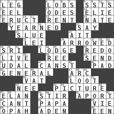 ACROSS 1. Part of a journey 4. Tennis shots 8. Fast planes 12. Snakelike fish 13. Lyric poems 14. Writer Wiesel 15. Spew [out] 18. Monthly bill 19. Nathan's nickname 20. Felt deep pity or tenderness 22. Declare 23. Turn sharply 24. Small island 25. Flowery wreath 26. Moved like an arrow 30. Indian title of respect (Mr.) 33. Inn 36. Make new 37. Not recorded 39. To riddle 40. Post 41. Freehold land 42. 2nd pers. sing. pres. of can (arch.) 44. Writing tablet 45. Commissioned military rank 47. Curve 50. Large container 51. Plunder 53. Born 54. Photo 57. Style 59. Disorderly outburst 61. To the left, to Queeg 63. Patter 64. Dad 65. Compete 66. Brightly colored fish 67. An important port of Yemen 68. Car or cant ending DOWN 1. Area sheltered from the wind 2. Suggestive of the supernatural 3. Cements 4. Old wives' tales, e.g. 5. Wrote a lyric poem 6. Benjamin's nick name 7. Fast jet (abbr.) 8. Elected representatives 9. Kill 10. Teat (slang) 11. Observe 16. Give a ring to 17. Loyal 21. Famous astronaut Armstrong 22. Title for a knight 24. "We ___ not amused" (Victoria) 26. Ripens 27. Shed a tear 28. Pulitzer Prize-winning author Ferber 29. Texas town _ City 30. Snaillike creature with no shell 31. Travel on or in a vehicle 32. "Terrible" tsar 34. Relating to the mouth 35. Lair 38. Veterans Day date 42. Feline 43. Baby powder 46. Actress Charlotte 48. Roll call or roster of names 49. Clever action or accomplishment 52. Collection of objects 53. Nanny 54. Corncob 55. SW Asia republic 56. One of the Great Lakes 57. Environmental prefix 58. Infant locale 59. Health resort 60. Small amount or degree 62. "___ Little Indians"