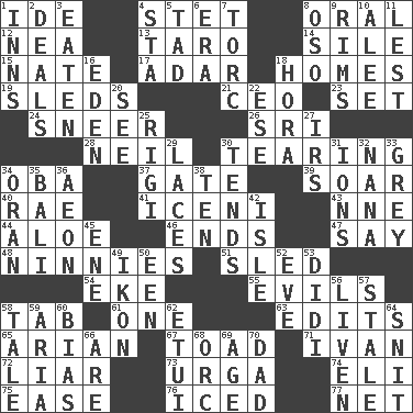 ACROSS 1. Binary compound 4. Proofreading order 8. Relating to the mouth 12. Teachers' org. 13. Pacific island yam 14. Filth; sediment 15. Nathan's nickname 17. The sixth month of the Jewish calendar 18. Dwellings 19. Bobsleighs 21. Corporate head (abbr.) 23. Arrange properly for use 24. Contemptuous expression 26. _ Lanka 28. Famous astronaut Armstrong 30. Separating forcefully 34. Chief or king in Benin or Nigeria 37. Yard entry 39. Fly high 40. Actress Charlotte 41. Ancient Celtic tribe of eastern Britain 43. Compass dir. 44. _ vera 46. Conclusions 47. Declare 48. Fools 51. Downhill vehicle 54. Supplement with great effort 55. Vices 58. Bar bill 61. Single 63. Proofreads 65. Believer in; advocate of (suffix) 67. Frog relative 71. _ the terrible 72. One who doesn't tell the truth 73. Capital and largest city of Mongolia 74. Connecticut Ivy Leaguer 75. Comfort 76. On the rocks 77. Fish or hair follower DOWN 1. Taverns 2. Allots cards 3. Eroded 4. R.R. building 5. Small boy 6. Epoch 7. Torque (variant) 8. Bear (Spanish) 9. Basketball hoops 10. Toward shelter 11. For fear that 16. Genesis locale 18. Israeli folk dance 20. Observe 22. Compass dir. 25. Swiss mountan, "Queen of the Mountains" 27. Big collection agency 29. Shoestrings 30. Watches over 31. Charged particles 32. Grandmother 33. Jennifer or Joel 34. Northwest Algerian city 35. Indonesian resort city 36. Period of immesurable duration 38. "___ Little Indians" 42. Capri or Wight 45. Compass dir. 49. Visual representation of an object 50. Car or cant ending 52. First lady 53. "You Light Up My Life" star Conn 56. Make or become more lively 57. Having lost freshness 58. Story 59. Roberta Peters solo 60. Prejudice 62. Needle case 64. In a ____ (agitated or irritated) 66. "We ___ not amused" (Victoria) 68. The grampus (Milton) 69. Personal question 70. June honoree