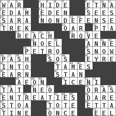ACROSS 1. Armed conflict 4. Flintstone garb 8. Inactive volcano in Sicily 12. Dutch treat 14. Locale of original sin 15. Observes 16. "Two Mules for Sister ____" 17. Unrelated to defense, as in spending 20. Long journey 21. Rowing implement 22. Parent Teacher Assoc. 23. Arrive at 27. Be footloose 29. Christmas carol 31. Queen of England 1702-14 34. Stone: prefix 35. Overwhelm 36. Romantic infatuation 39. Distress signal 41. Jane of fiction 42. To the inside or interior of 43. Domesticates 46. Merit 47. Comedian Laurel of Laurel & Hardy 48. A really long time 51. Ancient Celtic tribe of eastern Britain 54. Make lace 56. Modern: prefix 58. Mouths or openings 61. Pleas 66. Have the gumption 67. Portico 68. Lug 69. Singer James 70. Prong on a fork 71. At one time in the past 72. Snakelike fish DOWN 1. Compass direction 2. The sixth month of the Jewish calendar 3. More valued for its uncommonness 4. Layer 5. Wedding promise 6. Lair 7. Inside; within (prefix) 8. Compass dir. 9. 3-inch nail 10. Egg locale 11. At sea 13. Create 18. Ewer handle 19. Away 24. A saturated hydrocarbon 25. Small bed 26. Possessive pronoun 28. Flower holders 30. Plunders 32. And not 33. She-sheep 34. Give a jingle 36. Sliced dessert 37. Santa ___, CA 38. Ski resort town in Vermont 40. Suttee (variant) 44. Apple computer (short form) 45. Compass dir. 49. Single 50. Teachers' org. 52. Connecting point 53. Feeling or showing extreme anger 54. Trial 55. Opposed to 57. "Beetle Bailey" pooch 59. Johnson of "Laugh-In" 60. Lick closed 62. Actress Charlotte 63. Electrically charged atom 64. And so on (abbr.) 65. Observe