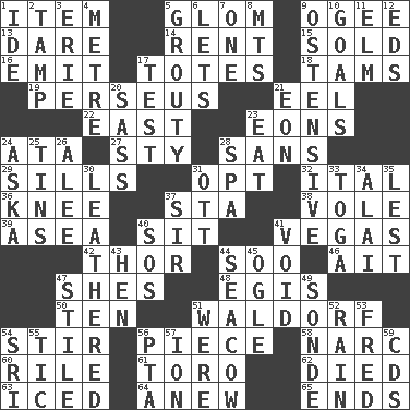 ACROSS 1. Detail 5. Take by theft 9. Double curve, resembling the letter S 13. Have the gumption 14. Monthly bill 15. Exchanged or delivered for money 16. Give off 17. Hauls 18. Scottish caps 19. Son of Zeus who helped slay Medusa 21. Snakelike fish 22. 90 degrees 23. Immeasurably long periods of time 24. _ moment's notice (2 wds.) 27. Filthy place 28. Without 29. Beverly of Met fame 31. Elect 32. Slanted text style (abbr.) 36. Leg joint 37. R.R. building 38. Short-tailed, large-bodied rat 39. At sea 40. Be seated 41. Viva Las _ 42. Son of Odin 44. "Barney Miller" actor Jack 46. Small island 47. "______ My Girl" (Turtles hit) 48. The front part of a cuirass 50. "___ Little Indians" 51. Apple salad 54. Tumult 56. Component 58. Drug cop 60. Cause heat under the collar 61. "Corrida" creature 62. Passed on 63. On the rocks 64. Afresh 65. Extremities DOWN 1. Binary compound 2. Pack (down) 3. One of the Great Lakes 4. Distance measurement (Brit.) 5. Sulky 6. Allows 7. Single 8. Mountains (abbr.) 9. Clearly or manifestly demonstrative 10. Purposes of endeavors 11. Shade tree 12. Begley and Asner 17. Trial 20. Backtalk 21. Period of immesurable duration 23. Consume 24. "____ silly question..." 25. Metal containers 26. Toward shelter 28. Health resort 30. Tough but pliablecoriaceous 31. Baseball player Mel 33. Ancient Roman robe 34. Jai ____ 35. For fear that 37. Title for a knight 40. Distress signal 41. Empty area or space 43. Layer 44. Manatee 45. Stare 47. Vertical member of a panel or frame 49. Something which is sent 51. Past tense of be (plural) 52. Precipitation 53. Flintstone 54. Indian title of respect (Mr.) 55. Nervous spasm 56. Parent Teacher Association (abbr.) 57. Electrically charged atom 59. Music discs