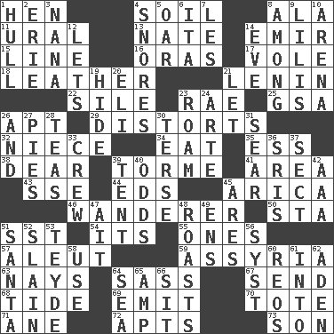 ACROSS 1. Layer 4. The visible part of the earth's surface 8. According to 11. Mountain range 13. Nathan's nickname 14. Arab leader 15. Actor's bit 16. Mouths or openings 17. Grand slam 18. Cordwainer's material 21. Soviet premier 1918-24 22. Filth; sediment 23. Actress Charlotte 25. Girls' org. (abbr.) 26. Fitting 29. What propaganda does 32. Sibling's daughter 34. Erode 35. Curvy letter 38. Letter starter 39. Singer Mel 41. Length times width 43. Compass dir. 44. Begley and Asner 45. N. Chile seaport 46. Roamer 50. R.R. building 51. Fast jet (abbr.) 54. It is 55. Washington bills 57. Eskimo relative 59. Nineveh was its capital 63. Negative votes 64. Backtalk 67. Post 68. Periodic rise and fall of the sea level 69. Send forth 70. Haul 71. One (Scot) 72. Tenement units (abbr.) 73. Boy, to dad DOWN 1. Frame or body of a ship 2. One of the Great Lakes 3. Grandmother 4. Sounds asleep 5. Rowing implement 6. Call ___ day 7. French article 8. Amid 9. Ms. Damita and namesakes 10. Sports stadium 12. Allows 14. Night before a holiday 19. Flintstone garb 20. Connecticut Ivy Leaguer 21. Allow 23. Wander 24. Johnson of "Laugh-In" 26. Plus 27. Sliced desserts 28. Beverages made from leaves 30. Laconic 31. Burn superficially 33. Ship's personnel 36. Indian titles of respect 37. Religious group 39. Portable shelter 40. Likelihood 42. Auto club (abbr.) 45. Ancient Greek god of war 47. Small island 48. Exposes to great heat 49. Followers of ems 51. Before Barbara or Clara 52. Killed 53. Miss Universe 1986, Barbara Palacios _ 56. System (abbr.) 58. Purpose 60. Vintage cars 61. To the inside or interior of 62. An important port of Yemen 64. Ocean 65. Electrical Unit 66. Be seated