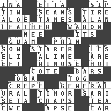 ACROSS 1. _ tizzy (2 wds.) 4. Singer James 8. Small drink 11. Metal container 12. Seines 14. Hoop that covers a wheel 15. _ vera 17. Corrects by punishment or discipline 18. ____ Jay Lerner 19. Cordwainer's material 21. Make _____ (do battle with) 23. Born 24. ___ a Wonderful Life 25. Island territory of the United States 27. Demure 30. Male child 31. A viewer who gazes fixedly 34. French article 37. Biblical high priest 38. Place in a line 39. "We ___ not amused" (Victoria) 40. Newt 41. Full of chinks, cracks, or crevices 43. Being at a high temperature 44. ____ d'Azur (French Riviera) 45. Soap units 47. Chief or king in Benin or Nigeria 49. Coat; cloak 50. Streamer paper 52. Commissioned military rank 56. Mountain range 57. Southeast Indonesia island 60. Indian skirt 61. Stalk of a moss capsule 62. Dice game 63. Afternoon social gathering 64. She-sheep 65. Domed church section 66. Ewer handle DOWN 1. Slanted text style (abbr.) 2. "Death on the ____" 3. Small Philippine buffalo 4. First name in cosmetics 5. Lacerate 6. Scottish cap 7. One (Scot) 8. Grain storage towers 9. SW Asia republic 10. Fenced enclosure 13. Compass dir. 14. Small pie 16. Inactive volcano in Sicily 20. Is hesitant and indecisive 22. Direct toward a target or goal 25. _ course 26. A single undivided whole 27. A-one 28. Western Nevada city 29. Angers 30. Observe 32. Pacific island yam 33. Came down and settled, as after flight 34. Cowardly lion portrayer 35. Greek god of love 36. Arrange properly for use 42. Inky black, to poets 44. Head covering 46. Eons 47. Declaim 48. Actor Lugosi 49. Laconic 50. Ship's personnel 51. And so on (abbr.) 52. Republicans 53. Assign a rank or rating to 54. Length times width 55. One who doesn't tell the truth 56. Purpose 58. Lyricist Gershwin 59. Atlas unit