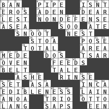 ACROSS 1. Forbid 4. Corncob 8. Is not 12. Greek god of love 14. An important port of Yemen 15. Letter starter 16. For fear that 17. Unrelated to defense, as in spending 20. At sea 21. "Barney Miller" actor Jack 22. Had dinner 23. Snout, nose 27. Egg locale 29. Portico 31. Introduce or present, as a question 34. "_____ Recall" 35. Length times width 36. Ancient Persian 39. Two (Sp.) 41. Russian ruler of old 42. Baking chamber 43. Gives food to 46. Waist strap 47. Falsehood 48. American tennis player Robert 51. Wash lightly 54. Put into a specified state 56. White ___ sheet 58. South American Indian 61. The property of being fit to eat 66. (Had) reclined 67. Small Philippine buffalo 68. Musical group of three 69. "Beetle Bailey" pooch 70. Long (Scottish) 71. Plant excrements 72. Car or cant ending DOWN 1. Actor Lugosi 2. Ancient Greek god of war 3. Olfactory organs 4. Baking dish 5. Wedding promise 6. Animal enclosure 7. Conclusions 8. Binary compound 9. Elected representatives 10. Political cartoonist Thomas 11. Woody plant 13. Comedian Laurel of Laurel & Hardy 18. A really long time 19. Enemy 24. Bear (Spanish) 25. Baseball player Mel 26. Frog relative 28. Arguments over trivial matters 30. At or to great height 32. Ocean 33. Hearing organ 34. Portable shelters 36. Crowd into 37. First lady 38. Accusation by an informer 40. Dry up 44. Connecticut Ivy Leaguer 45. Lair 49. Actor Linden 50. Compass dir. 52. Grain storage tower 53. Related on the mother's side 54. Lick closed 55. Pulitzer Prize-winning author Ferber 57. Pismires 59. Quote 60. At once, immediately (arch.) 62. Paper or plastic container 63. Period 64. Small drink 65. Distress signal