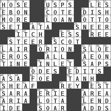 ACROSS 1. Flexible conduit 5. United States Postal Service (abbr.) 9. French article 12. Inky black, to poets 13. ____ d'Azur (French Riviera) 14. Food container 15. Greater amount 16. Grant temporary use of 17. "Beetle Bailey" pooch 18. Arrange properly for use 19. "One Day ___ Time" 21. Contemptuous expression 22. Hankering 24. Double-curved letter 26. To separate or throw off 27. Navigate 28. Native of Scotland 29. Den 30. Greek mythologigal hunter 32. _ gin 36. Greek god of love 37. 100% 38. A really long time 39. Prong on a fork 40. An arm off of a larger body of water 42. Plant excrements 43. Lyric poems 44. Prepares for publication 46. White ___ sheet 49. Enemy 50. Hyperbolic tangent 51. Bundle of cut stalks of grain 53. Marina Del _, California 54. Eastern Standard Time (abbr.) 57. "Two Mules for Sister ____" 58. 4th largest of the Great Lakes 61. Length times width 62. Operatic vocal solo 63. Globular water bottle used in Asia 64. Grant temporary use of 65. Binary compound 66. Fly high 67. Sums up DOWN 1. Cloth borders 2. Mitch Miller's instrument 3. Conclusion 4. Compass dir. 5. Southern CA. univ. 6. "Barney Miller" actor Jack 7. Parent Teacher Assoc. 8. Elected rep. 9. 61 cubic inches 10. First name in cosmetics 11. Dinah or Pauly 14. Spanish title 19. Adept person 20. Through, poetically 21. Fast jet (abbr.) 23. Laconic 24. Learning spot: Fr. 25. Manchild 27. Indian skirt 28. Beverly of Met fame 29. Allow 31. The wife of a rajah (variant) 32. Indian antelope 33. Resembling or made to resemble leather 34. I made a mistake 35. Followers of ems 40. Wedding promise 41. Wig 43. No longer planned or scheduled 45. 24 hours 46. Slender Brazilian palm 47. Pottery fragment 48. Nest on high 52. American Automobile Association (abbr.) 53. Bring up, as a child 55. Transmit 56. Bits 58. Raised railways 59. Friend of Pooh 60. Call ___ day 61. In the manner of