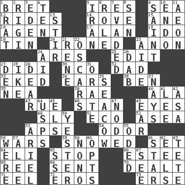 ACROSS 1. Cy Young winner Saberhagen 5. Angers 9. Ocean 12. Amusement-park features 14. Be footloose 15. A saturated hydrocarbon 16. Representative 17. ____ Jay Lerner 18. Wedding promise 19. Metal container 20. Pressed 23. Soon (poet.) 24. Ancient Greek god of war 25. Prepare for publication 27. "You Light Up My Life" star Conn 30. Non-commissioned officer (abbr.) 32. Male parent 33. Supplemented with great effort 34. Hearing organs 36. Benjamin's nick name 38. Teachers' org. 39. Actress Charlotte 40. Insect wing 43. Sorrow 46. Comedian Laurel of Laurel & Hardy 48. Sight organs 49. Insidious 51. Environmental prefix 52. At sea 53. Domed church section 54. Scent 56. Armed conflicts 58. Overwhelmed 61. Put into a specified state 64. Biblical high priest 65. Constrict 66. First name in cosmetics 68. To sift 69. Posted 70. Started a card game 71. Snakelike fish 72. Greek god of love 73. Celtic language DOWN 1. Naughty child 2. Swiss mountan, "Queen of the Mountains" 3. Paradise 4. Nine, plus one 5. SW Asia republic 6. Hero or heavy, e.g. 7. Dodged 8. Elected rep. 9. Virtuous person 10. Inside; within (prefix) 11. A really long time 13. Tumult 21. French philosopher Descartes 22. Motion picture awards 23. Helper 24. Help 26. Pat or tap gently 27. Lair 28. Eisenhower's nickname 29. Letter starter 31. Declaim 35. Manatee 37. Negative votes 41. Area sheltered from the wind 42. White ___ sheet 44. United States Postal Service (abbr.) 45. Raised railways 47. Connecting point 48. Hearing organ 50. Next before 53. Satellite of Uranus 55. Wrote a lyric poem 56. We are 57. Toward shelter 59. Words to Nanette 60. Elects 61. Play the lead 62. Snakelike fish 63. False hair 65. Compass dir. 67. Observe