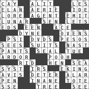 ACROSS 1. Island 4. Came down and settled, as after flight 8. French article 11. Flair 13. Nest on high 15. Binary compound 16. Old wives' tales, e.g. 17. Rep 18. Give off 19. Type of eclipse 21. Elected rep. 22. Allows 23. Begley and Asner 24. Car or cant ending 27. Adept person 29. Centimeter-gram-second unit of force 30. Baking chambers 34. Air pressure measure (abbr.) 36. Movie discs 39. Mexican monetary units 40. Perceives with the eye 41. Sets of matching outer garments 43. Political cartoonist Thomas 44. Leg coverings 46. Lick closed 47. Third day of the wk. 48. Zeal 49. "Silly old bear" 51. To free from 53. Layer 54. Ocean 57. System (abbr.) 60. Big collection agency 63. Supplementing with great effort 65. Opinion 66. Prevent from occurring 69. Having or resembling wings 70. Animal enclosure 71. Empty; void 72. Lug 73. Compass dir. 74. Relationship diagram 75. Perceive with the eye DOWN 1. Cell (Danish) 2. Verbally 3. Tall tales 4. Auto club (abbr.) 5. Part of a journey 6. Angers 7. Prong on a fork 8. Citrus frut 9. Prepare for publication 10. Arranges properly for use 12. Teachers' org. 14. Inactive volcano in Sicily 18. Veterans Day date 20. Marina Del _, California 25. Extremities 26. Mole, birthmark 28. Police officer (slang) 29. What propaganda does 31. Son of Isaac 32. Sense of smell 33. Fast jet (abbr.) 34. Lightbulb-shaped fruit 35. Post 37. Expire 38. Staphylococcus 40. Health resort 42. A type of plum 45. Indian title of respect (Mr.) 50. Single 52. "You Light Up My Life" star Conn 54. Grain storage towers 55. Related on the mother's side 56. Match 57. Plant excrements 58. Jacques Cousteau's middle name 59. Trig term 61. Monthly bill 62. Play the lead 64. Krazy ___ of comics 67. Compass dir. 68. To riddle