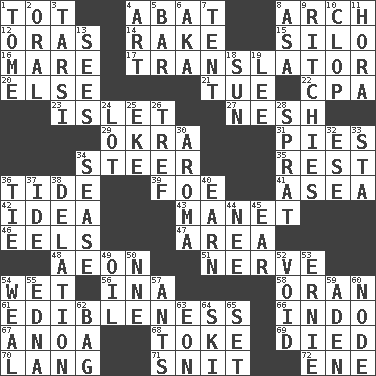 ACROSS 1. Small child 4. Blind as ____ 8. Bowlike part 12. Mouths or openings 14. Libertine 15. Grain storage tower 16. Female horse 17. Interpreter 20. Otherwise 21. Third day of the wk. 22. Tax preparer (abbr.) 23. Small island 27. Soft 29. Gumbo ingredient 31. Sliced desserts 34. Bull 35. Respite 36. Periodic rise and fall of the sea level 39. Enemy 41. Toward the sea 42. The content of cognition 43. French painter Edouard 46. Snakelike fish 47. Type of rug 48. Period of immesurable duration 51. Effrontery 54. Dripping 56. _ tizzy (2 wds.) 58. NW Algerian seaport 61. The property of being fit to eat 66. Southeast Asian peninsula 67. Small Philippine buffalo 68. Casino tip 69. Passed on 70. Austrian-born American filmmaker Fritz 71. In a ____ (agitated or irritated) 72. Compass dir. DOWN 1. Heavy book 2. Spoken 3. Tarsus (plural) 4. Tate display 5. Oblong piece of solid material 6. Alias (abbr.) 7. Portable shelter 8. White ___ sheet 9. Actors Guy, Robert Welles, and Clint 10. Hoof sound 11. Israeli folk dance 13. Perceives with the eye 18. Player for Phoenix 19. Area sheltered from the wind 24. Car dealer's back yard 25. Supplement with great effort 26. Unclean, religiously 28. Small fatty European fish 30. Scent 32. Compass dir. 33. R.R. building 34. Gospel singer Marvin 36. Standoff 37. Binary compound 38. Accusation by an informer 40. Merit 44. Born 45. Hearing organ 49. Petroleum 50. Compass dir. 52. Lacking any legal or binding force 53. Bert's buddy 54. Welt 55. Pulitzer Prize-winning author Ferber 57. Pismires 59. An important port of Yemen 60. Connecting point 62. Paper or plastic container 63. Period of immesurable duration 64. What Jean-Claude Killy likes to do 65. Arrange properly for use