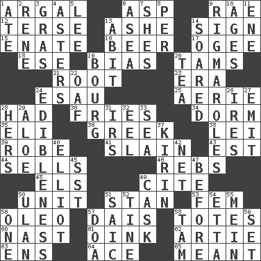 ACROSS 1. Therefore, facetiously 6. Viper 9. Actress Charlotte 12. Laconic 13. American tennis player Robert 14. Attach a signature 15. Related on the mother's side 16. Fermented drink made from hops 17. Double curve, resembling the letter S 18. Compass dir. 19. Prejudice 20. Scottish caps 21. Carrot, for example 23. Epoch 24. Son of Isaac 25. Nest on high 28. Possessed 30. Strips of potato fried in deep fat 34. Dormintory (informal) 35. Biblical high priest 36. Of Greece 38. Luau accessory 39. Loose flowing garment 41. Killed 43. Eastern Standard Time (abbr.) 44. Exchanges for money 46. Confederate soldiers (slang) 48. Raised railways 49. Quote 50. A single undivided whole 51. Comedian Laurel of Laurel & Hardy 53. Opposite of masc. 56. Margarine 57. Raised platform 58. Lugs 60. Political cartoonist Thomas 61. Pig sound 62. Nick name for Arthur 63. Followers of ems 64. Adept person 65. Intended DOWN 1. Had dinner 2. French philosopher Descartes 3. Pate de foie ____ 4. Michaelmas daisies 5. Area sheltered from the wind 6. Toward the sea 7. "______ My Girl" (Turtles hit) 8. For each 9. Frustrating wastes of time 10. Matures 11. Compass dir. 13. "This won't hurt ____!" 14. Flew 19. Town 20. Beverage made from leaves 22. Clumsy lout 24. The property of being fit to eat 26. Angers 27. Send forth 28. Possessive pronoun 29. Medicinal plant 31. Big collection agency 32. Snakelike fish 33. Ocean 37. Japanese brewing company 40. American author Paul (1891-1958) 42. Remaining after all deductions 45. Fast jet (abbr.) 47. Prior to 49. Keg 50. ____ Bator 51. Ketch in the Levant 52. Prong on a fork 54. Singer James 55. Count _ (2 wds.) 56. Single 57. ___ good deed 58. Scottish cap 59. Arrange properly for use