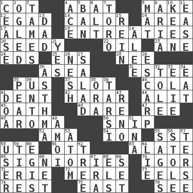 ACROSS 1. Small bed 4. Blind as ____ 8. Create 12. Mild oath 14. Bodily heat indicating an inflammation 16. Type of rug 17. _ mater 18. Pleas 20. Sleazy 22. Petroleum 23. One (Scot) 24. Begley and Asner 25. Followers of ems 28. Born 30. Toward the sea 31. First name in cosmetics 35. Fluid product of inflammation 37. Notch 40. Root beer relative 41. Undesirable depression on a surface 42. Ethiopian city, capital of Harari 44. Came down and settled, as after flight 45. Pledge 46. Have the gumption 47. To riddle 48. Odor 50. Clip 52. Nursemaid (var.) 54. Electrically charged atom 55. Fast jet (abbr.) 58. Shoshoni 61. Baseball player Mel 63. Having winglike extensions 65. Seigniories (variant) 70. Russian composer Stravinsky 71. One of the Great Lakes 72. Haggard of country music 73. Snakelike fish 74. Relief 75. 90 degrees 76. Perceive with the eye DOWN 1. Stop 2. Stared 3. Makes less strong or intense 4. Adept person 5. Bar 6. The first octave above the treble staff 7. "Corrida" creature 8. Floor protector 9. Roberta Peters solo 10. Peachy ____! 11. Relaxation 13. June honoree 15. It's straight from the horse's mouth 19. Toward shelter 21. It is so 26. Tender 27. Vegetable dish 29. Fortification 30. Respiratory problem 32. Lacquered or enameled metalware 33. Writer Wiesel 34. Ingest 35. Lightbulb-shaped fruit 36. To (old English) 38. Mouth or opening 39. Tarsus (plural) 41. ___ good deed 43. Western Nevada city 49. Mine, in Marseilles 51. _ tizzy (2 wds.) 53. Tiny particle 55. Gurus 56. Fur scarf 57. Laconic 58. One who makes use of a thing 59. Become fatigued 60. The front part of a cuirass 62. Relationship diagram 64. Untruth 66. Remaining after all deductions 67. Lyricist Gershwin 68. Raised railways 69. Put into a specified state