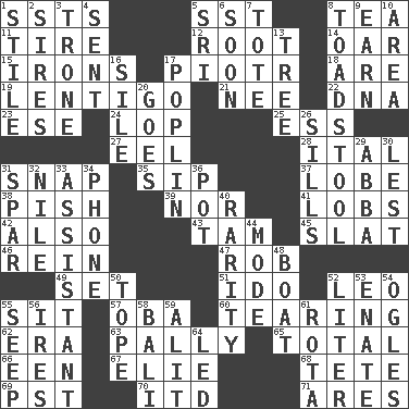 ACROSS 1. Fast planes 5. Fast jet (abbr.) 8. Beverage made from leaves 11. Hoop that covers a wheel 12. Carrot, for example 14. Boat paddle 15. Metal shackles 17. Peter (Polish) 18. "We ___ not amused" (Victoria) 19. Small, flat, pigmented spot on the skin 21. Born 22. Heredity factor (abbr.) 23. Compass dir. 24. Trim (branches) 25. Curvy letter 27. Snakelike fish 28. Slanted text style (abbr.) 31. Fastener 35. Small drink 37. Ear part 38. Expression of disdain 39. And not 41. Tennis shots 42. In addition 43. Scottish cap 45. Narrow board 46. It's straight from the horse's mouth 47. Director Reiner 49. Put into a specified state 51. Wedding promise 52. Lion 55. Be seated 57. Chief or king in Benin or Nigeria 60. Lacerating 62. Period 63. Friendly 65. Add up to 66. Car or cant ending 67. Writer Wiesel 68. Wig 69. Pacific Standard Time (abbr.) 70. It would 71. Ancient Greek god of war DOWN 1. Vertical member of a panel or frame 2. Fathers 3. Heavy duty weighing machine 4. Emitted 5. Indian title of respect (Mr.) 6. Within a short period 7. Lug 8. Inedible or poisonous agaric 9. Merit 10. Type of rug 13. Relationship diagram 16. Drop; flow; fall 17. Cotton for raincoats, e.g. 20. Moves 26. Beverly of Met fame 29. Swedish rock group 30. For fear that 31. Practice fight 32. The longest river in the world 33. Aide 34. Give a jingle 36. Plant holder 40. Noteworthy scarcity 44. Method 48. Water vessel 50. Drink excessively 52. 61 cubic inches 53. Related on the mother's side 54. Stares at amorously 55. Ooze 56. Angers 58. Indonesian resort city 59. Set down 61. Round or rotation of duties 64. Directed
