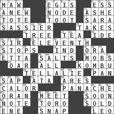 ACROSS 1. Opening into something insatiable 4. The front part of a cuirass 8. Curvy letter 11. Afresh 13. Thickened enlargement 14. American tennis player Robert 15. Haul 16. A blast of a horn 17. "Two Mules for Sister ____" 18. More disrespectful 21. Receives possession of 22. Family _ (genealogy) 23. Beverage made from leaves 25. Binary compound 26. Title for a knight 29. Veterans Day date 32. Ceases 34. Working for oneself (abbr.) 35. Mouth or opening 38. Singer James 39. Table seasonings 41. Disorderly crowds 43. Boat paddle 44. 100% 45. Dried seaweed eaten as food 46. Copy Pinocchio 50. Baking dish 51. Plant excrement 54. "One Day ___ Time" 55. Ancient Greek god of war 57. Bodily heat indicating an inflammation 59. Flamboyance 63. NW Algerian seaport 64. Confront 67. Within a short period 68. Brief written record 69. "Corrida" creature 70. Exchanged or delivered for money 71. Compass dir. 72. Fastener 73. Lion DOWN 1. Floor coverings 2. Small Philippine buffalo 3. Soaks 4. Main course 5. Thick or sticky substance 6. Wedding promise 7. Put into a specified state 8. 1973 Nobel Price Winner (Physics) Leo 9. Fragment 10. Gospel singer Marvin 12. 270 degrees 14. White ___ sheet 19. Angers 20. Snakelike fish 21. Make lace 23. Portable shelter 24. Extremities 26. Compass dir. 27. "Tell ____ the Marines!" 28. Roll call or roster of names 30. Country estate 31. Like (prefix) 33. Component 36. Play 37. Swedish rock group 39. Table seasoning 40. Silent film actress Nazimova 42. Player for Phoenix 45. Peachy ____! 47. Ewer handle 48. Portable computer 49. Lyricist Gershwin 51. Biscuitlike quick bread 52. Composer Copland 53. Food holder 56. Backtalk 58. Single 60. Calm and collected 61. Hollow 62. Inside; within (prefix) 64. Mountains (abbr.) 65. A really long time 66. Epoch