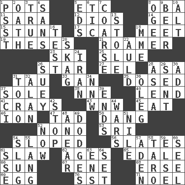 ACROSS 1. Plant holders 5. And so on (abbr.) 8. Chief or king in Benin or Nigeria 11. "Two Mules for Sister ____" 12. "Vaya con ____" 14. Set 15. Difficult or unusual or dangerous feat 17. Get outta here! 18. Confront 19. College papers 21. Nomad 23. What Jean-Claude Killy likes to do 25. Change direction abruptly 26. Play the lead 27. Snakelike fish 28. White ___ sheet 31. The 19th letter of the Greek alphabet 33. Separate the seeds from cotton 35. Administered medicine 37. Flatfish 38. Compass dir. 40. Grant temporary use of 41. Trading vessels 43. Compass dir. 45. Consume 46. Electrically charged atom 47. Bit 50. Mild oath, euphamism for damn 52. Words to Nanette 53. _ Lanka 54. Slanted 56. Chalkboards 61. Cole _ (cabbage dish) 62. Eons 65. Peak District village in England 66. Player for Phoenix 67. French philosopher Descartes 68. Celtic language 69. Oval reproductive body of a fowl 70. Fast jet (abbr.) 71. Christmas carol DOWN 1. Inconspicuous attention getter 2. Pledge 3. Loyal 4. Without 5. Begley and Asner 6. Nervous spasm 7. Unrefined 8. Double curve, resembling the letter S 9. Fermented drink made from hops 10. Keyboard modifier key 13. Took without asking 16. Trial 18. Madame (abbr.) 20. Heroin 22. Old (Scot.) 24. SW Asia republic 26. Chop _ 28. At sea 29. Emitted 30. Say or write further 31. "Corrida" creature 32. Actor Alda or Thicke 34. Compass dir. 36. Cassini of fashion 37. _-fi 39. Conclusions 42. Obstruct or block passage 44. Armed conflicts 48. Approach 49. Evades 51. Mediterranean tributary 52. At this time 54. Snaillike creature with no shell 55. Austrian-born American filmmaker Fritz 57. An important port of Yemen 58. Pacific island yam 59. Otherwise 60. Sew up the eyelids of hawks and falcons 61. Compass dir. 63. Followers of ems 64. Put into a specified state