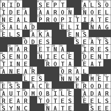 ACROSS 1. To free from 4. Back-to-school mo. 8. In addition 12. The main thing one is thinking about 14. Composer Copland 16. Christmas carol 17. Actress Patricia 18. Conciliate 20. Vegetable dish 22. Biblical high priest 23. Tired old horse 24. Raised railways 25. Alias (abbr.) 28. Followers of ems 30. Lyric poems 31. Theater features 35. Spoil 37. Inactive volcano in Sicily 40. Angers 41. Post 42. Sibling's daughter 44. Gouge 45. Prong on a fork 46. Roll call or roster of names 47. Ingest 48. Approach 50. Relating to the mouth 52. French article 54. Compass dir. 55. Was introduced to 58. Curvy letter 61. Adept person 63. Wear away 65. Car 70. The sixth month of the Jewish calendar 71. Posterior 72. Hauls 73. Snakelike fish 74. Synchronize (abbr.) 75. Nathan's nickname 76. Perceive with the eye DOWN 1. Remove soap 2. Perfect 3. Allots cards 4. Plant excrement 5. Hearing organ 6. Adept person 7. Drink excessively 8. Cuckoo 9. Grant temporary use of 10. Bristle 11. Cassini of fashion 13. According to 15. Mediterranean tributary 19. Airtight sealed metal containers 21. Male parent 26. Peachy ____! 27. Moving or stirring 29. A glass for beer 30. Severe or trying experience 32. Type of rug 33. Portable shelter 34. Fast jet (abbr.) 35. Chow _ 36. Singer Murray 38. Modern: prefix 39. 13-14th century defensive garment 41. R.R. building 43. Merit 49. 480, 500 or 516 sheets of paper 51. Deep reverence 53. Highlander 55. Methods 56. Peak District village in England 57. Laconic 58. Hearing organs 59. Chop _ 60. Comedian Laurel of Laurel & Hardy 62. Inky black, to poets 64. Actress Charlotte 66. The grampus (Milton) 67. Call ___ day 68. Allow 69. Compass dir.